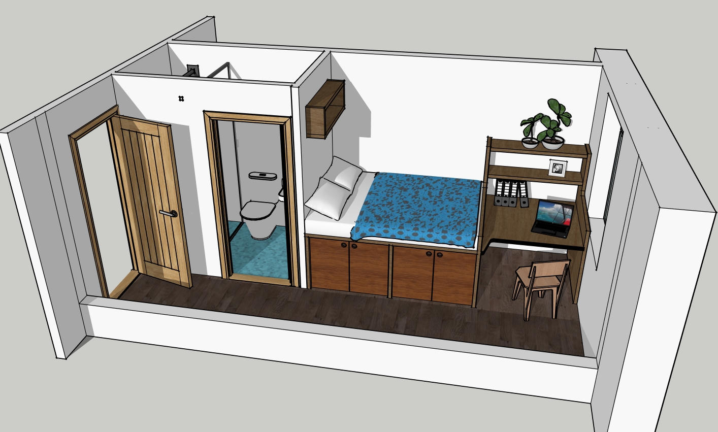 render this cutaway sketch of a student bedroom make the structure of the bed thick plywood an oak plank laminate on the floor warm colours on the walls
