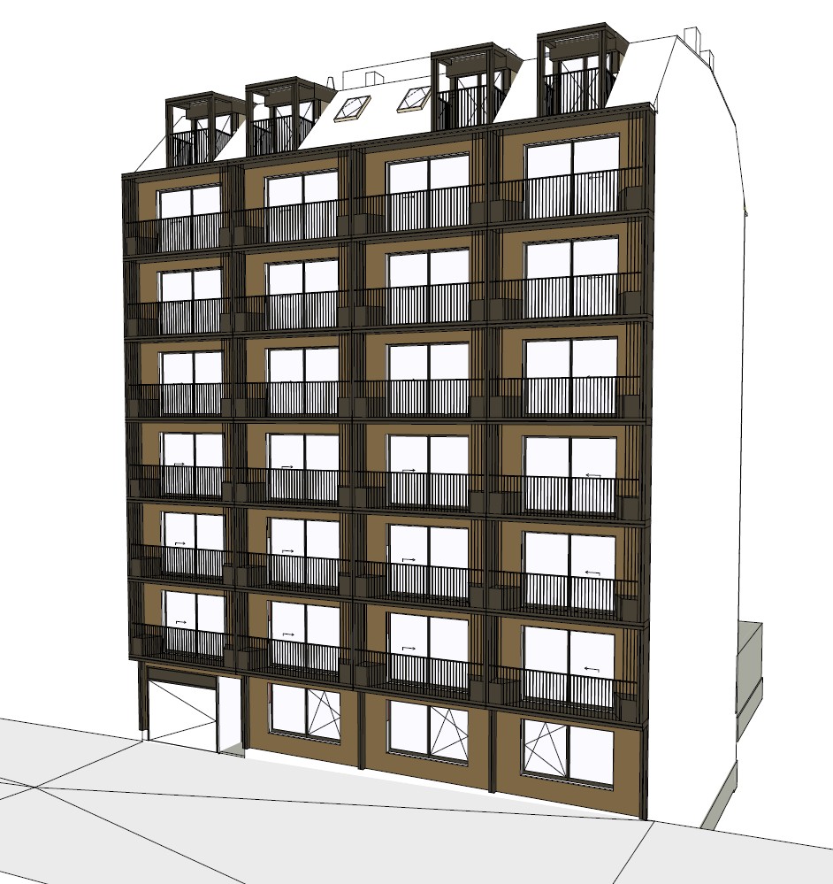 render a realistic modern apartment building in an urban setting six stories tall with deep brown and beige accents the facade features large windows and intricate dark green railings highlight the rooftop structures with a subtle dark gray set the mood with a warm afternoon light casting gentle shadows across the building the atmosphere should feel inviting and lively with a clear blue sky overhead and the suggestion of bustling city life around