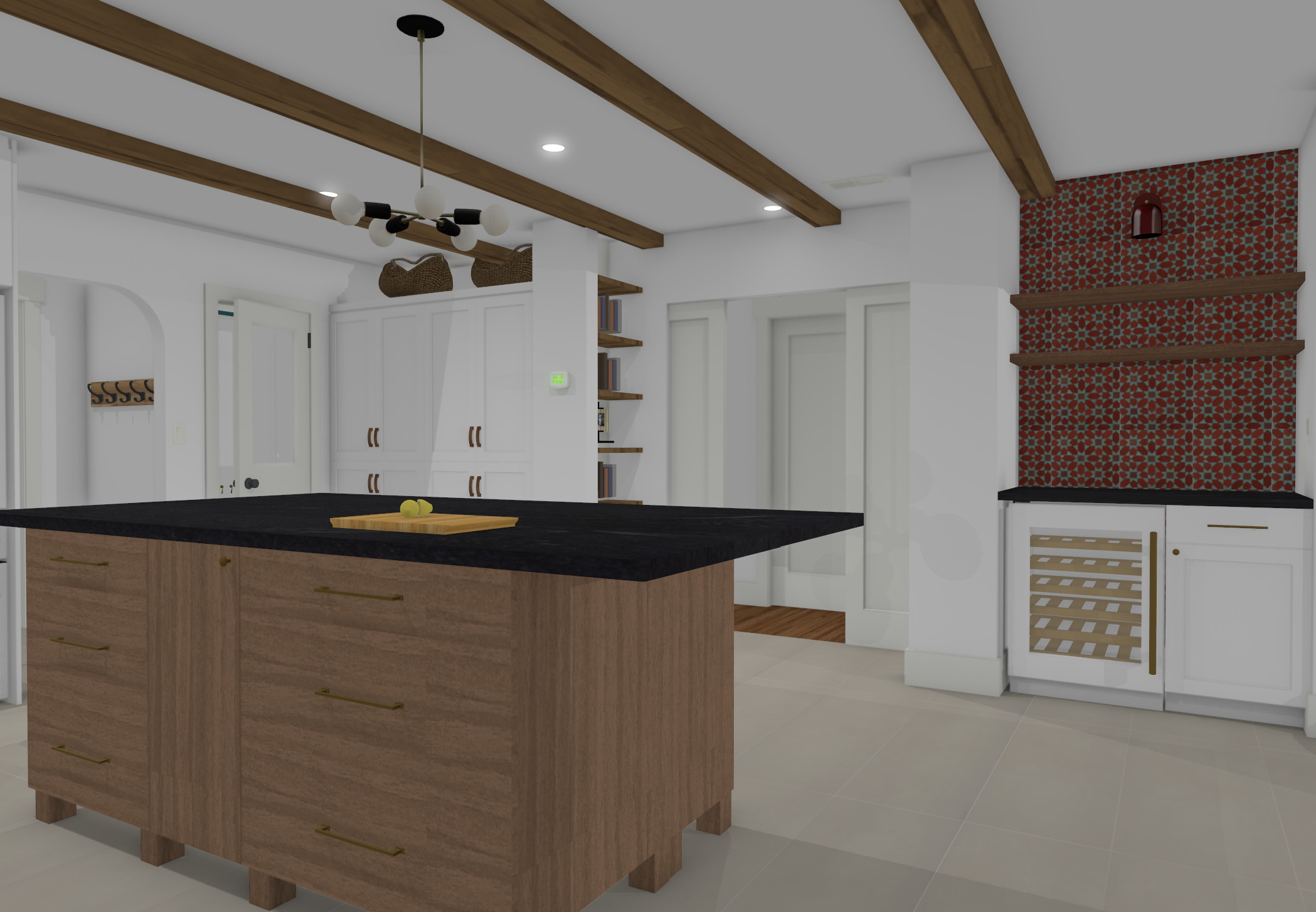 create a photorealistic rendering of this kitchen with soft warm lighting