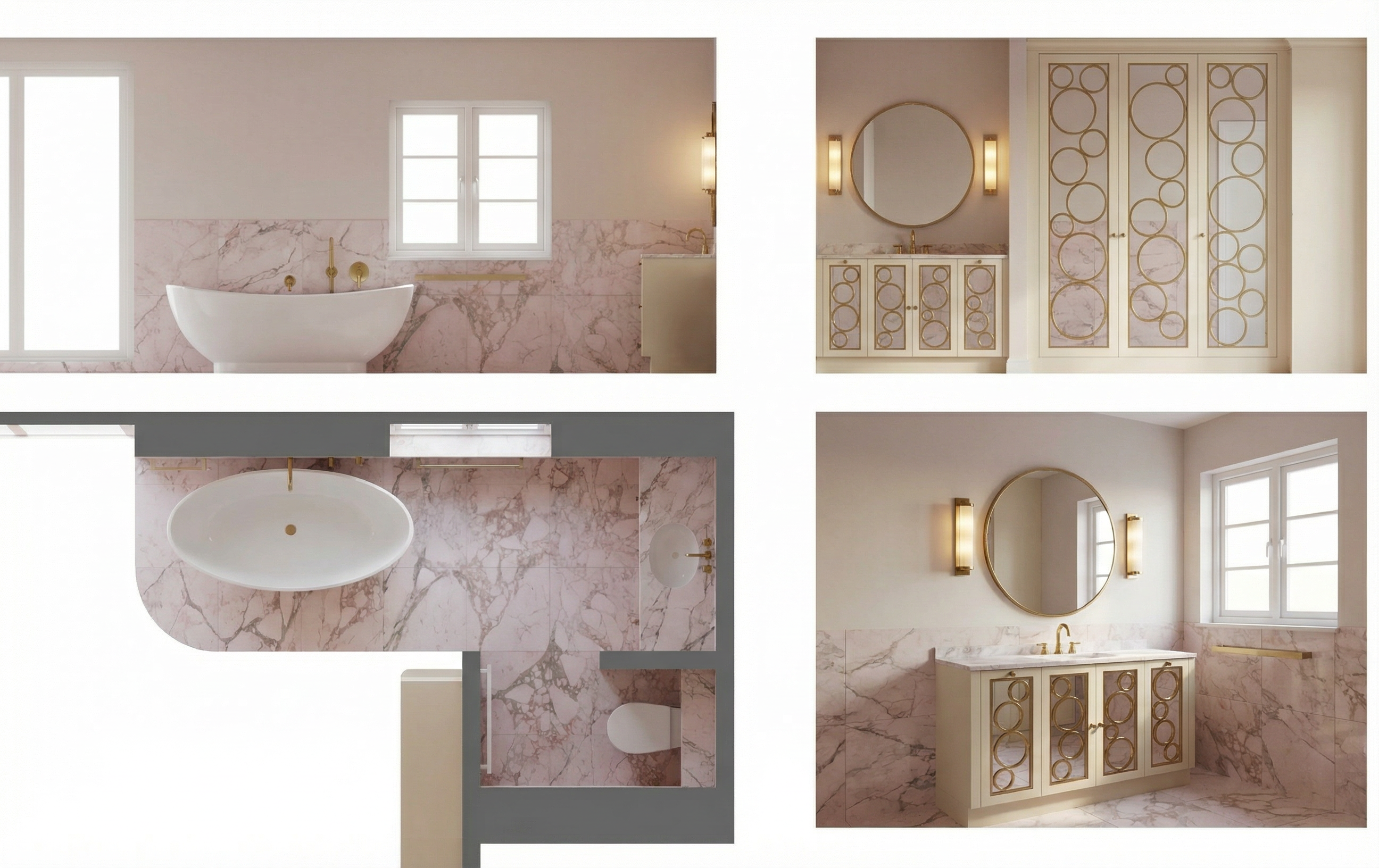 realistic render with smooth nordic light ambient light from inside people standing in the big window add drapes curtains and model some nature around the house pick up truck and a defender in front of the house