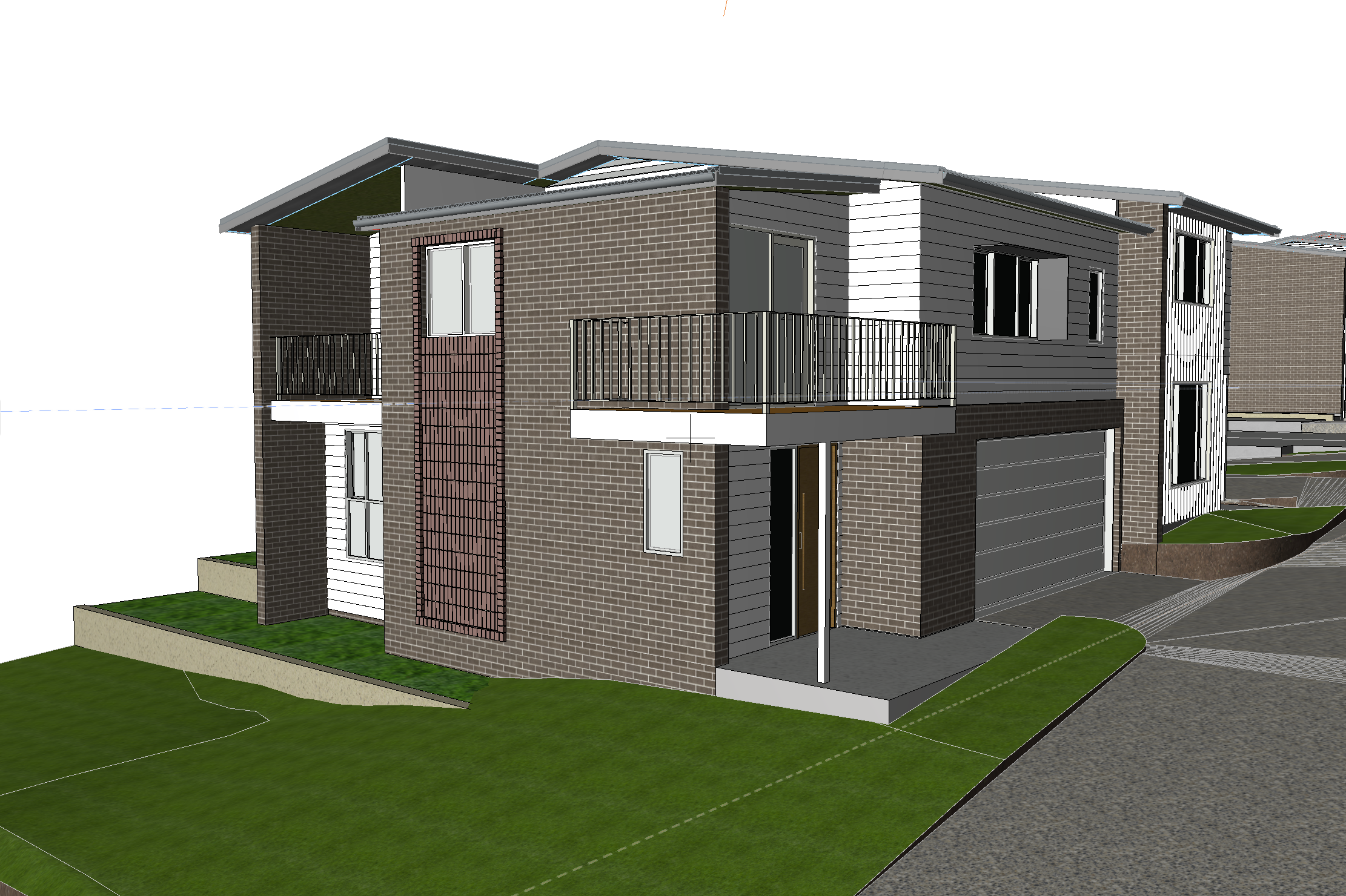 transform this archicad image into a high resolution render include landscaping a car and trees in the background
