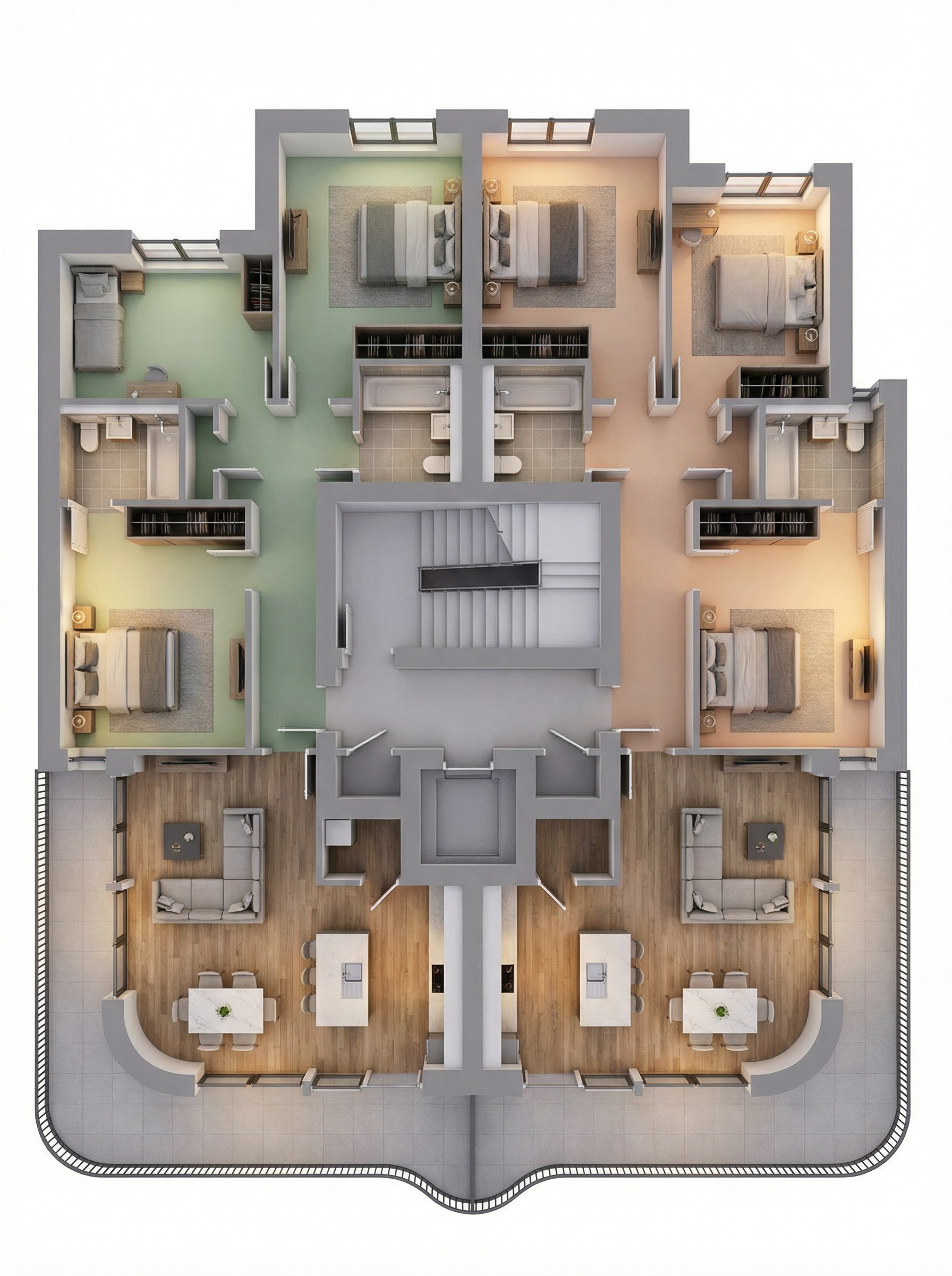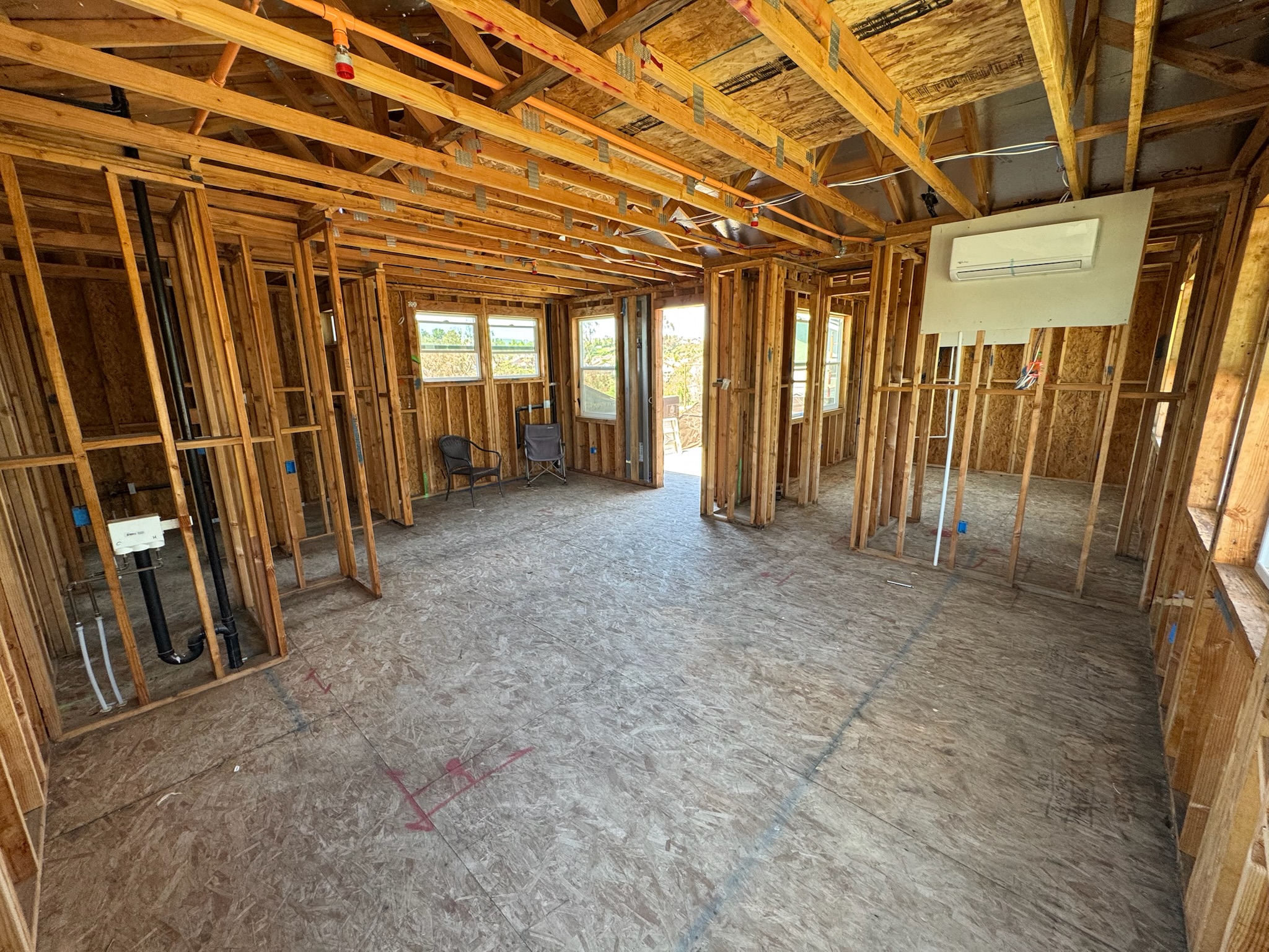 convert this framed adu interior into a finished simple modern farmhouse adu keep all walls windows and room layout exactly as built add light oak wood flooring warm white drywall walls white shaker kitchen cabinets along back wall quartz countertops matte black fixtures and hardware create small open living area with compact sofa and coffee table add bedroom area with queen bed and minimal nightstands add finished bathroom with light tile and simple vanity recessed ceiling lighting realistic residential finishes bright natural daylight cozy and uncluttered adu interior architecture
