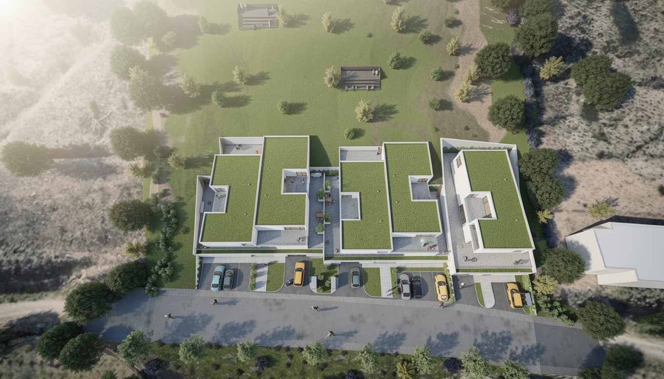 important preserve the existing geometry and the existing context exactly as provided do not modify alter reinterpret add remove scale or reshape any geometry do not change the site surroundings street layout neighboring buildings vegetation or context elements do not modify geometry scale proportions buildings road layout sidewalks or surrounding context in any way do not change text photorealistic architectural rendering clean and balanced contrast calm cinematic mood style contemporary european residential architecture minimalist premium understated delet all cars and people existing include people subtle motion blur for realism keep the green roof