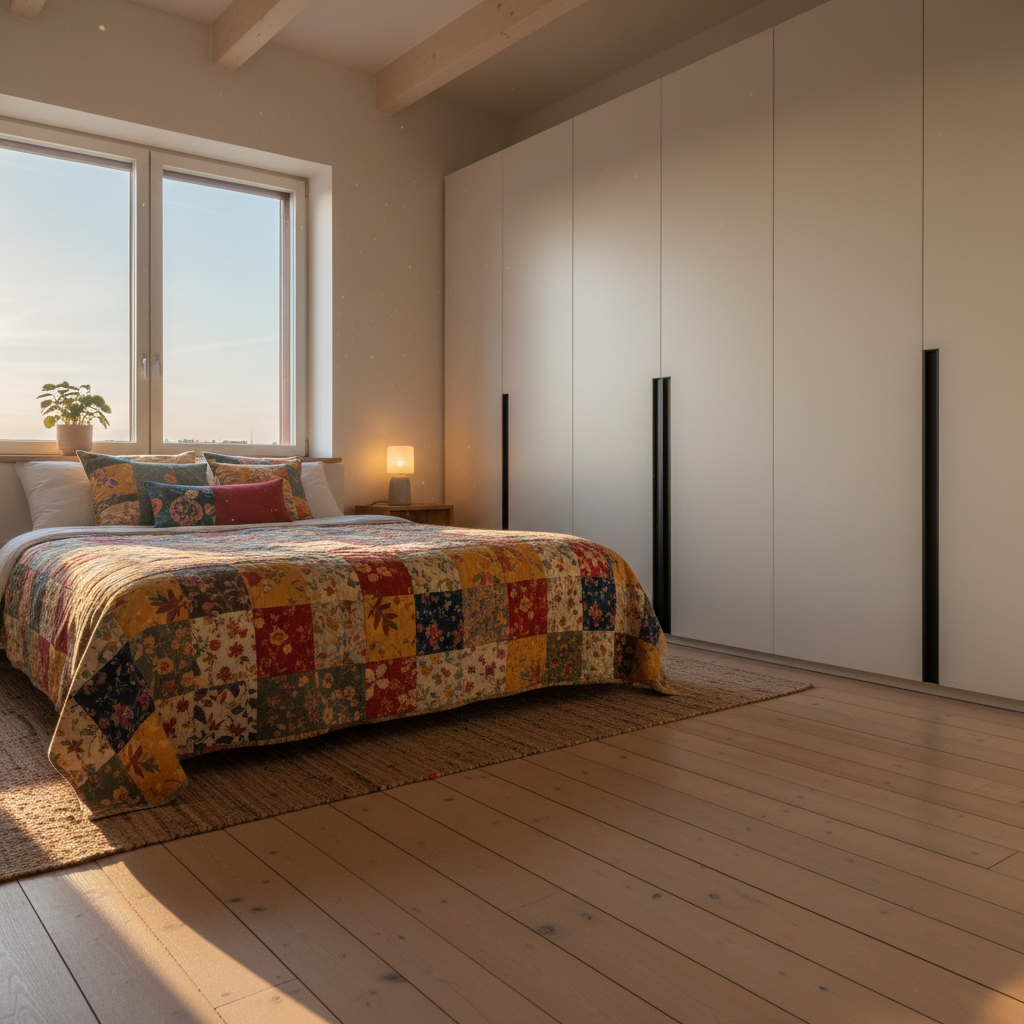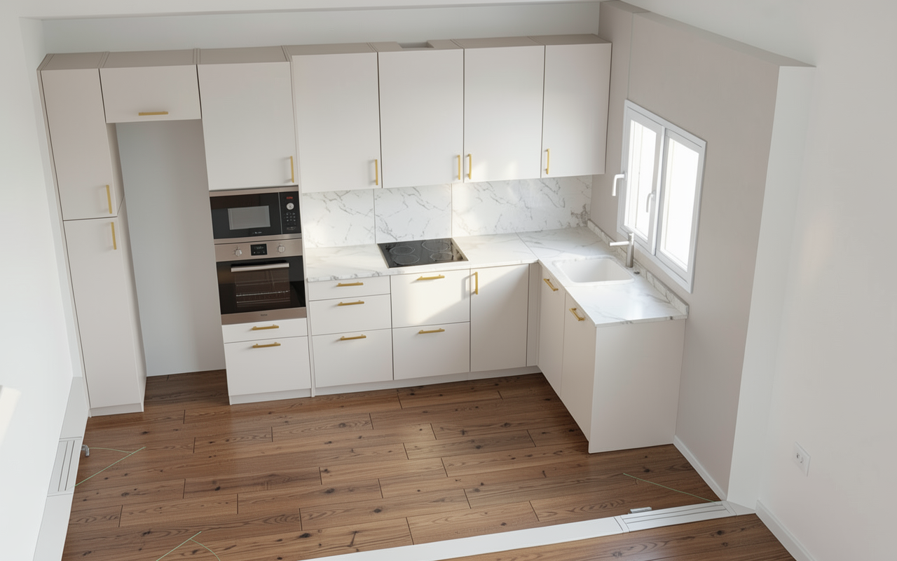 quiero una imagen fotorealista el suelo que te aparece en blanco va a ser en madera color roble el mobiliairo no modifiques la distribucion solo quiero que le des textura en color blanco mate el tirador es segun aparece en la imagen en color dorado la encimera y la pared que queda debajo de los muebles altos dale una textura porcelanico calacatta en el hueco que tienes a ade un frigorifico en color acero el sulo debe ser mas clarito mas natural el fregadero y grifo tambien en acero inoxidable a ade el frigorifico