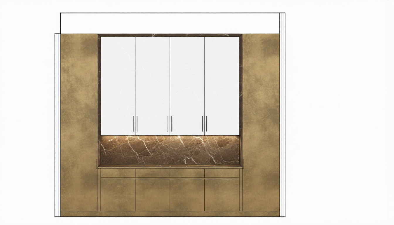 in the middle cabinets make it match the patina metal on the outside but keep a 2 marble border around the set in area