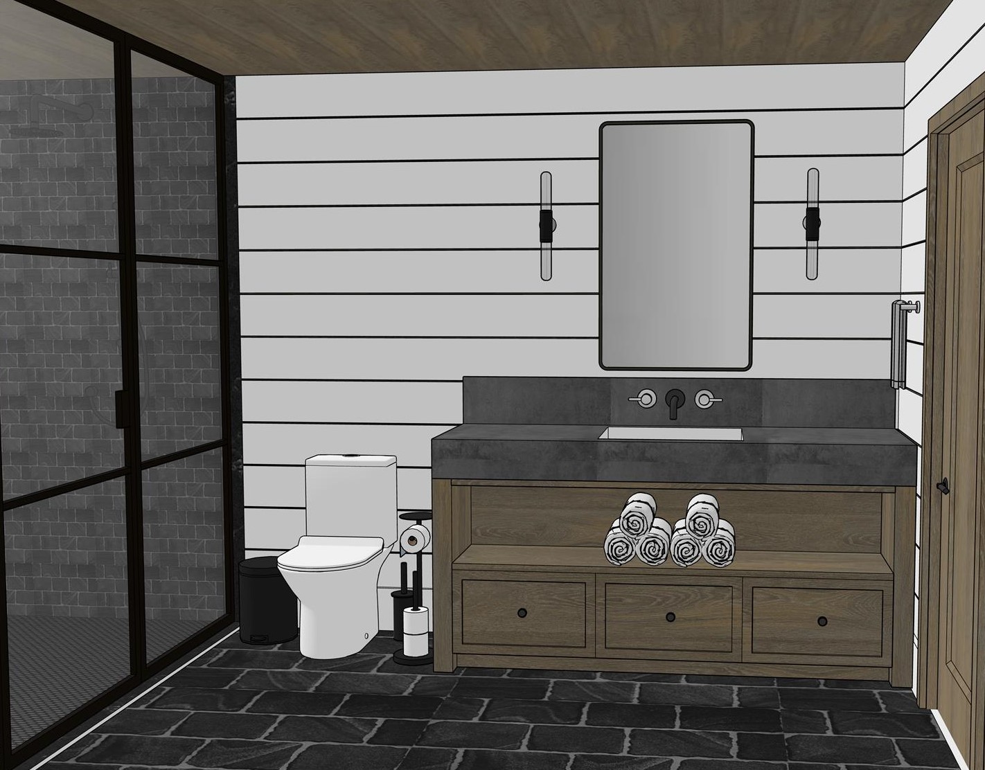 rustic add light white wood shiplap walls dark stone floor add sage green vanity make door
