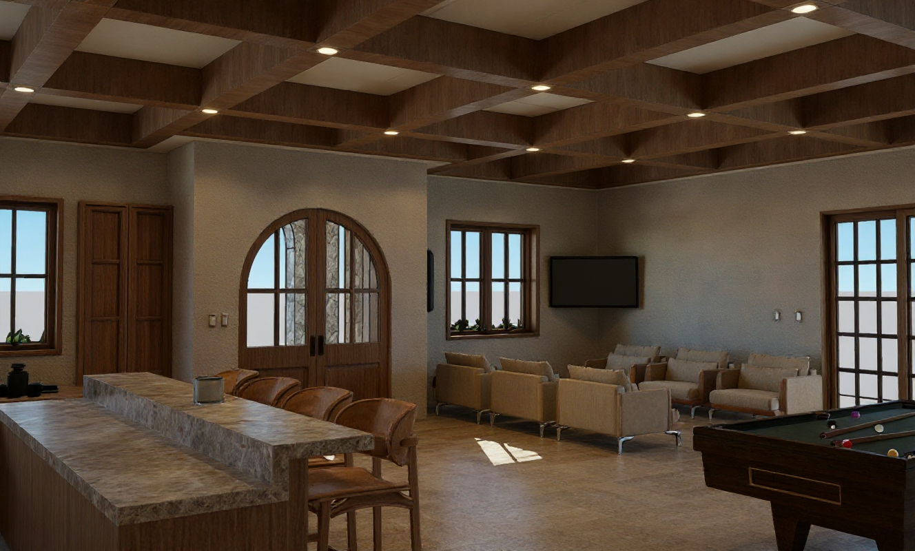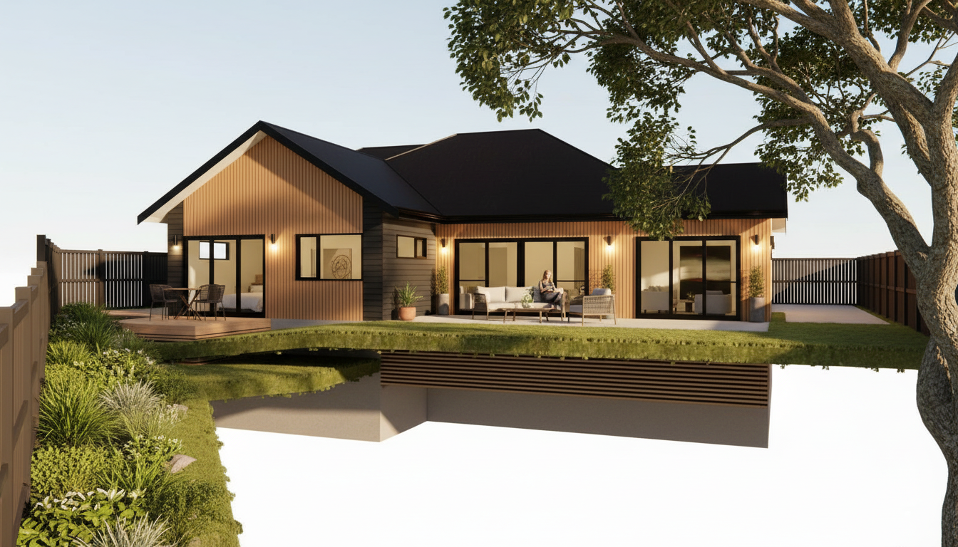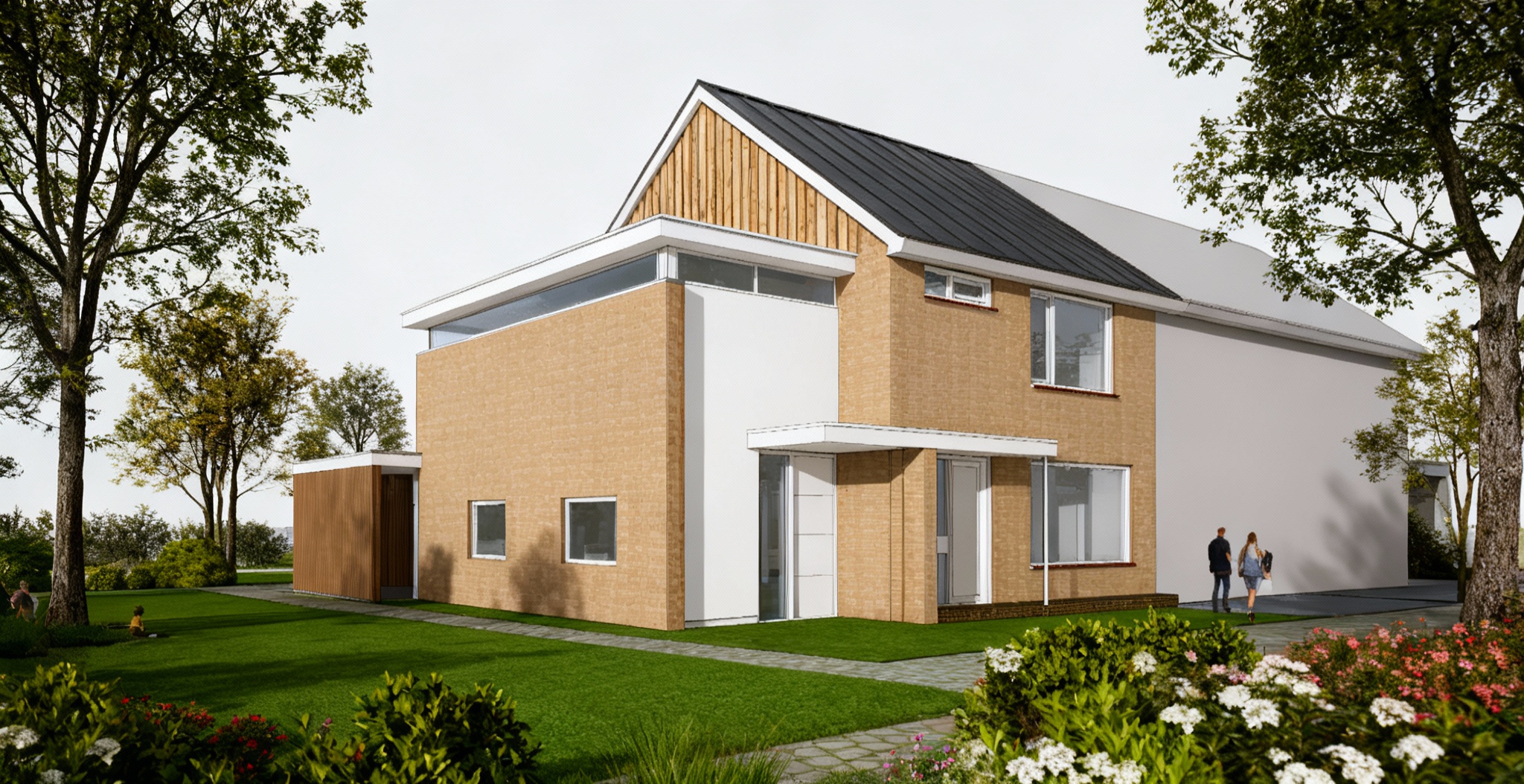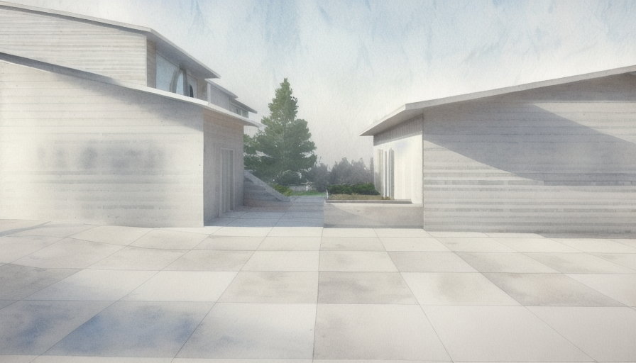 modernist exterior shot render the buildings in this image with soft textures the roofs are textured corrugated metal the walls are light wood like a cabin render the image so it architectural dimension overlay make it look like a technical sketch with loose watercolor washes and white paper soft unfinished fade around edges architecture