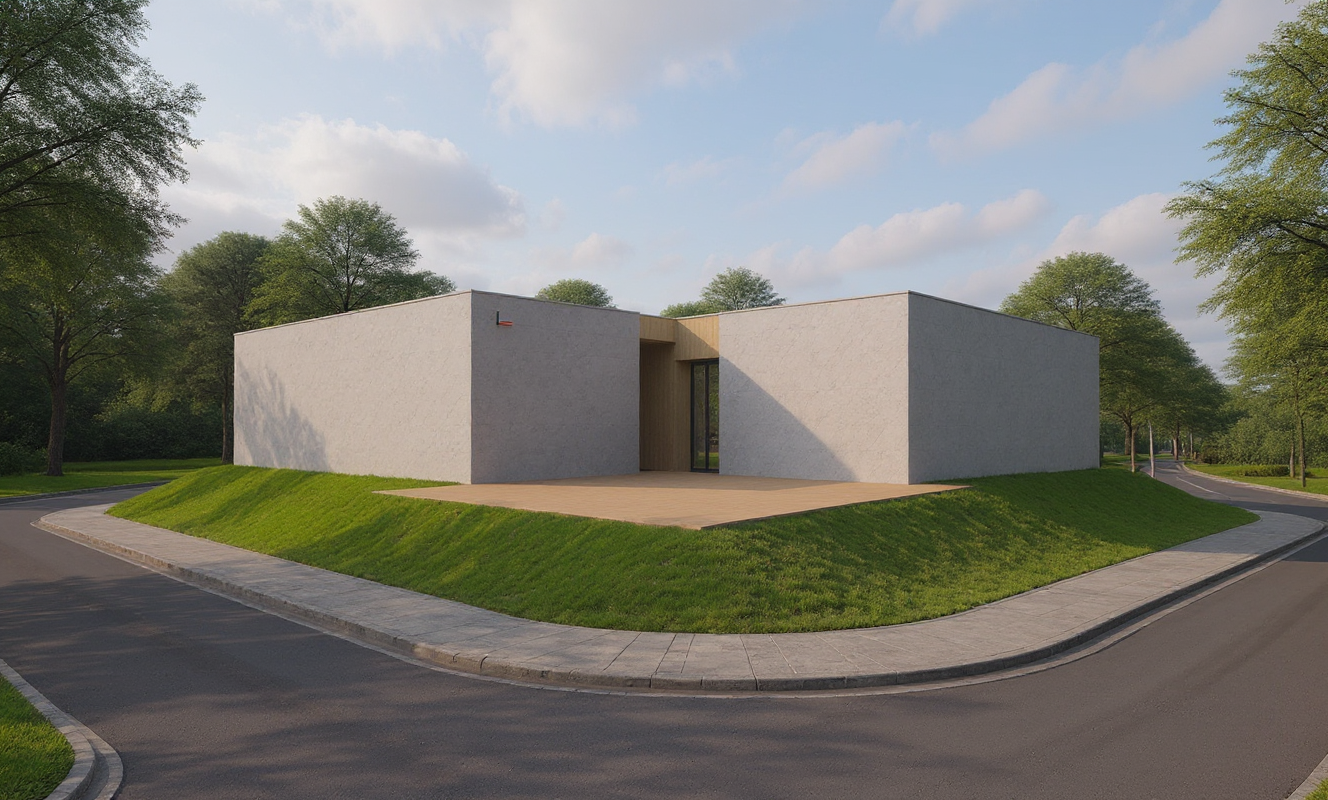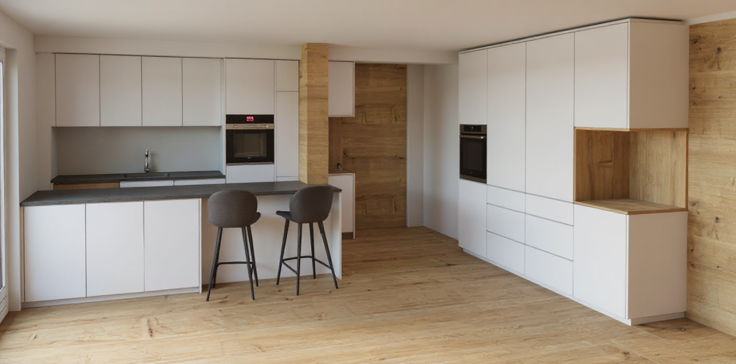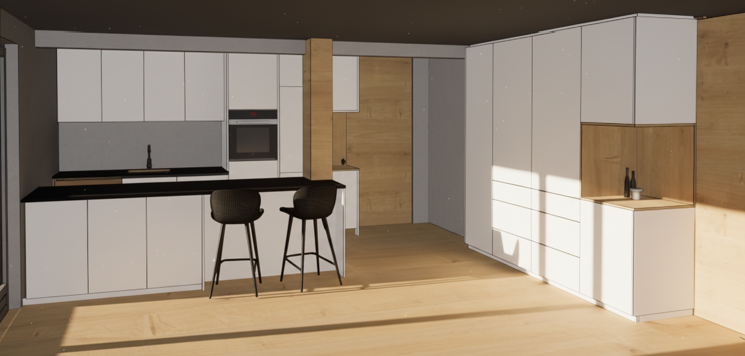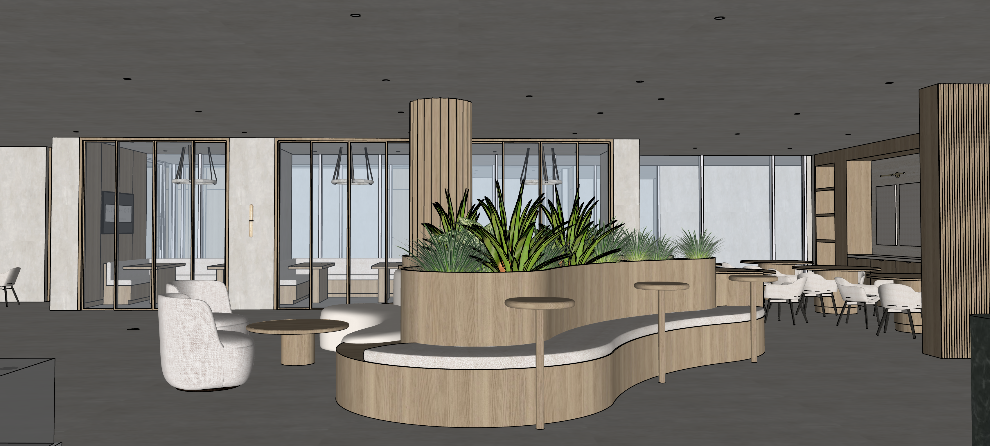 create a highly realistic render of a refined interior space based on the attached sketchup model the scene should embody warm minimalism and quiet luxury combining natural textures tonal harmony and refined craftsmanship use a soft neutral palette of warm beige light taupe pale oak and muted grey tones walls finished in brushed lime plaster with a warm off white hue subtly textured and matte the ceiling in smooth micro cement dark warm grey with recessed black downlights flooring in wide plank european oak with a natural satin finish showing gentle grain and tonal variation the banquette seating should feature a light oak timber base with vertical grain curving organically around a central planter the seat upholstery is a tactile linen blend fabric in warm greige matte and softly textured integrated side tables in matching oak with smooth rounded edges the planter top is honed travertine or limestone pale and warm in tone fill the planter with architectural indoor plants structured grasses and slender green foliage with natural variation in tone and height providing softness and freshness without visual clutter furniture throughout should mix light oak and warm stone finishes upholstered lounge and dining chairs in stone sand and light taupe fabrics with a tactile woven appearance shelving and joinery in oak veneer with softly glowing integrated led lighting 2700 3000k behind shelves and display niches highlighting textures and material architecture