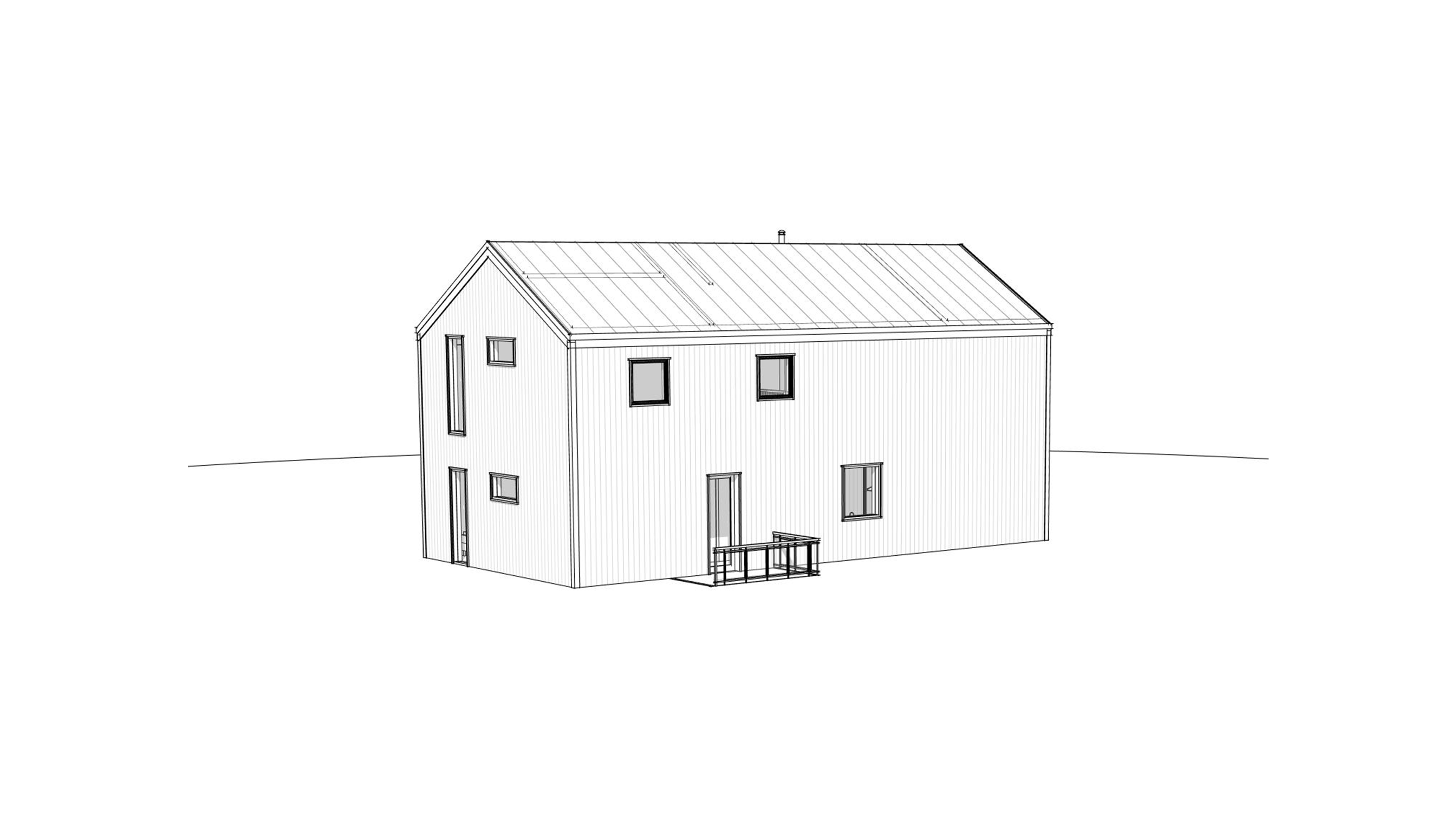 front view of a clean contemporary cabin architectural exterior home rendered in cinematic vibrant golden hour lighting cabin in a coastal setting with faint streaks of light coming through trees in the surrounding area warm glow and coastal reflections off of the windows cloudy and stormy sky shining rustic select grade vertical wood siding green manicured landscape around structure with gardens and patches of grass black standing seam metal roof prominent trees in the background high fidelity photorealistic visualization crisp shadow falloff refined facade geometry soft atmospheric depth premium architectural photography mood ultra clean composition and materials black window trim flat roof photorealistic render