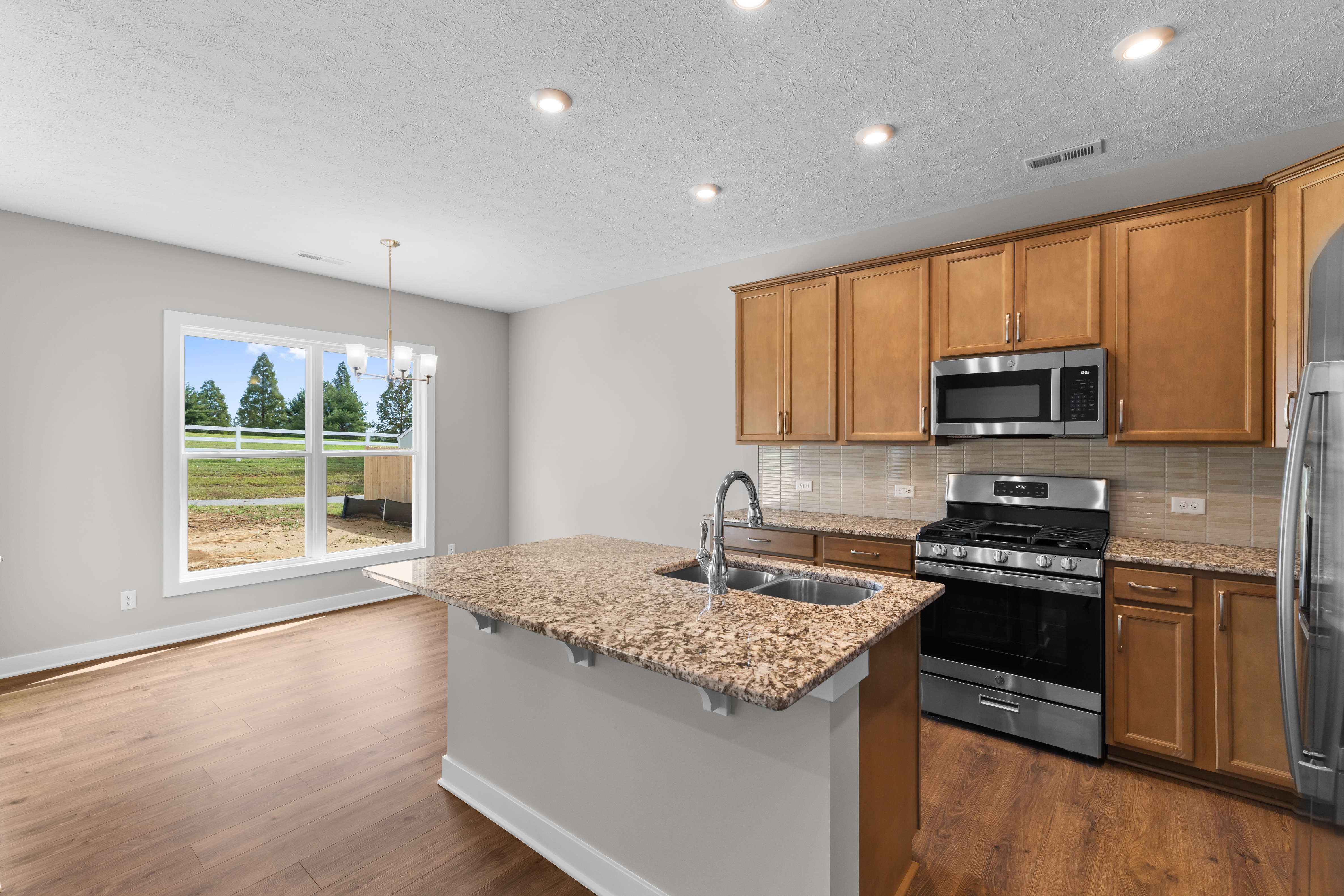 fill this empty home with furniture and a loving family setting up for thanksgiving dinner with a dining room and chairs in the dining room by the window with mom and children seated and dad bringing the turkey over to the table from the kitchen include fall and thanksgiving decor do not change any of the structures in the original image including the kitchen island and lighting chandelier
