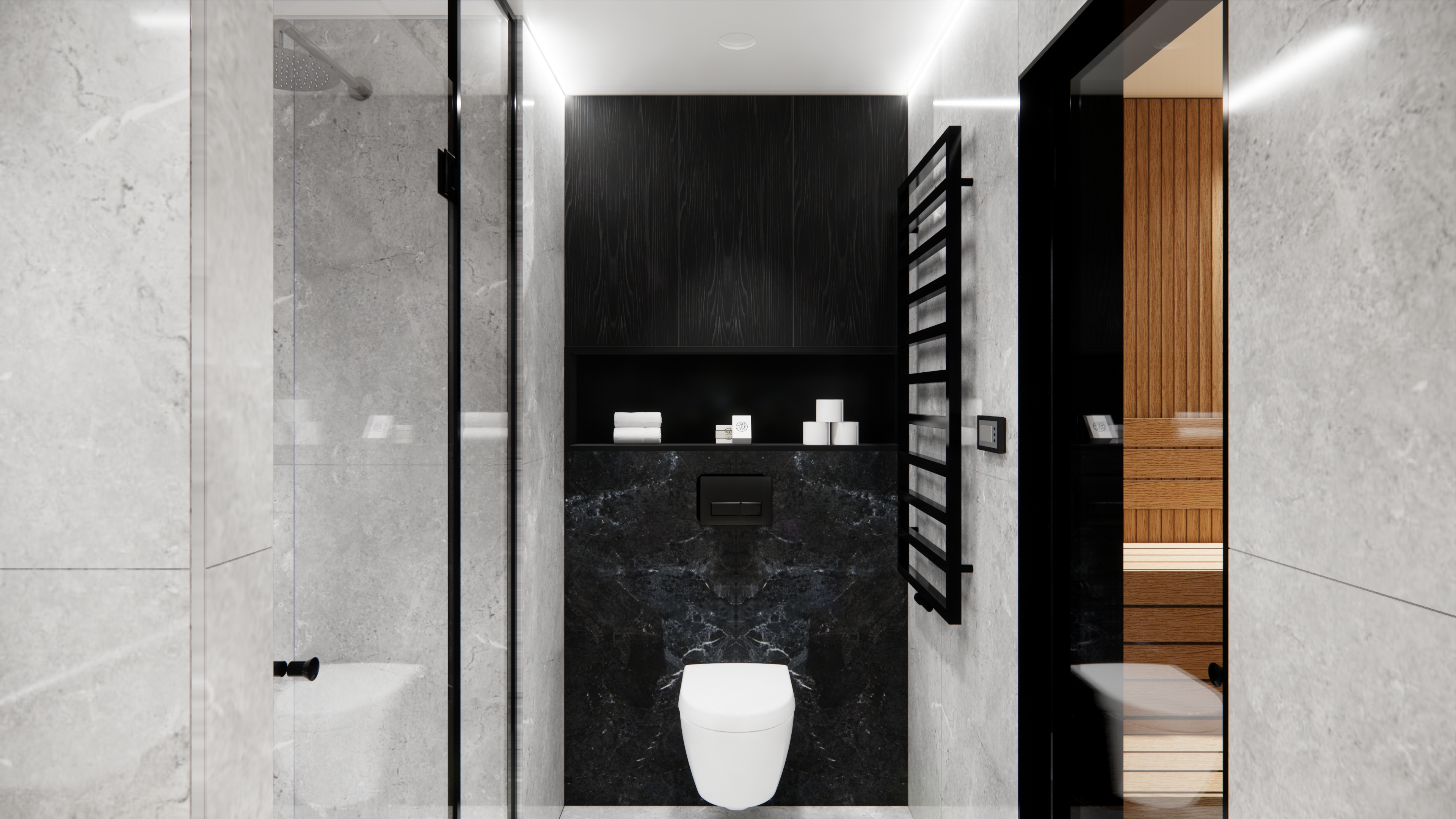 create a photorealistic image add lighting replace materials with photorealistic real materials add some slight reflections and shines to materials insert an ies light cast replace soft materials and cloths for high end real like materials add water falling from shower and some steam as it is hot add a person to the image girl in white towel drying her hair in left side of the image in front of the wall motion blurred as a long exposure