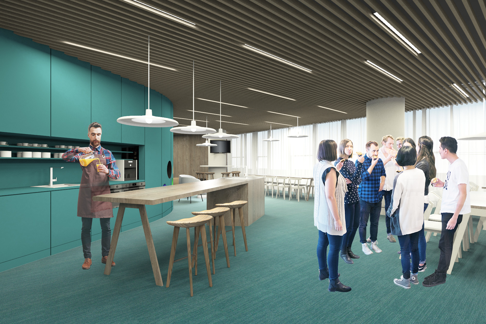 render a modern office lounge with a calming and professional atmosphere the floor is covered in a soft turquoise carpet the walls are adorned with light wood paneling adding warmth and texture the ceiling features sleek dark grey slats with ambient lighting highlighting the space include a vertical column wrapped in lush vibrant green moss for a natural touch there are various modern pouffes scattered across the room in shades of teal brown and black design a glass meeting room on the right with visible minimalist furniture in neutral tones the overall lighting is soft yet ample creating an inviting environment