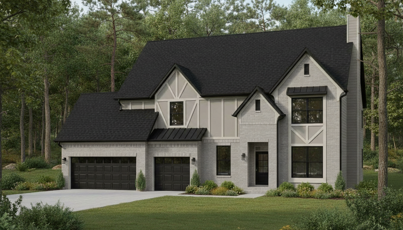 a modern architectural rendering of two apartment buildings with a sleek minimalist design the buildings have a clean white facade contrasted with matte black accents and black metal elements on the balconies and roof edges the front lawn is a vibrant green complemented by the earthy tones of the sidewalk and street the atmosphere is bright and sunny with a clear blue sky creating a lively and inviting setting