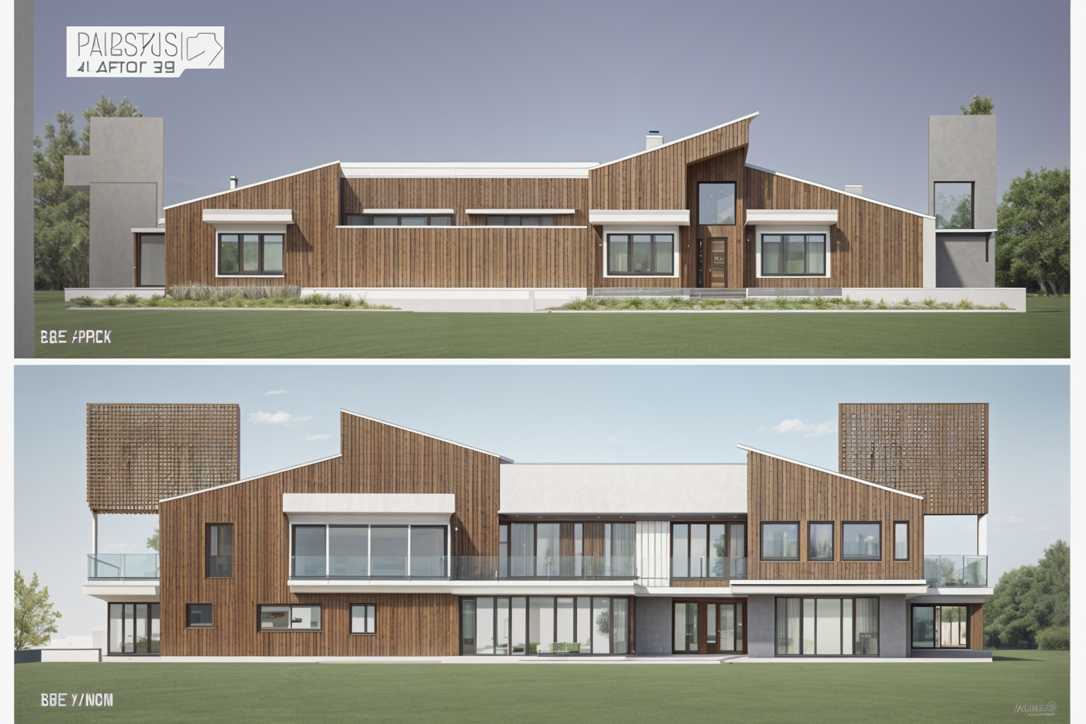 render as a barndominium style with off white cultured stone and stone sill white reverse board and batten white siding black windows and window trim all black trim set wall with all windows farther back as a covered patio and show deep shadow render tall cultured stone columns and reverse board and batten gable area up front as one plane show grass in front and tree line behind