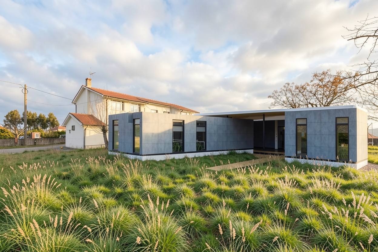 towering modern skyscraper amidst lush green hills with a complex structure made light grey concrete walls the building sports a unique geometric design with terraces adorned with greenery the surrounding hills are a vibrant green providing a serene backdrop a crystal clear pool reflects the bright blue sky earthy tones are present in the scattered trees and the subtle pathways atmosphere is peaceful and harmonious conveying a sense of futuristic urban living blended with nature please fill the surrounding hills with olive trees and some houses make it an elite residential zone the sea is on the bottom left of this picture