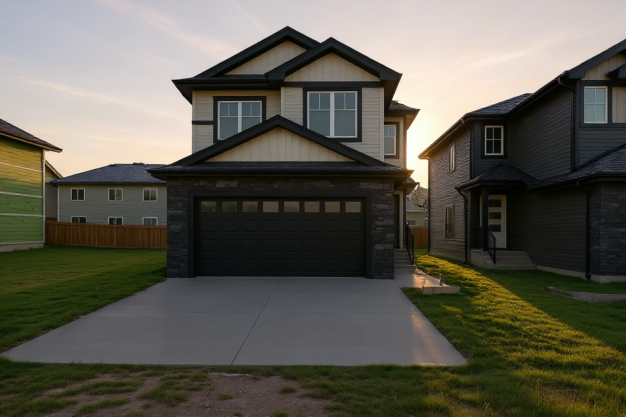 light grey garage door colour horizontal door panels colorbond stell roof in dark grey large lantern wall lights wall finish is vertical wood wall panels in white large pebble stone driveway remove all other elements on driveway
