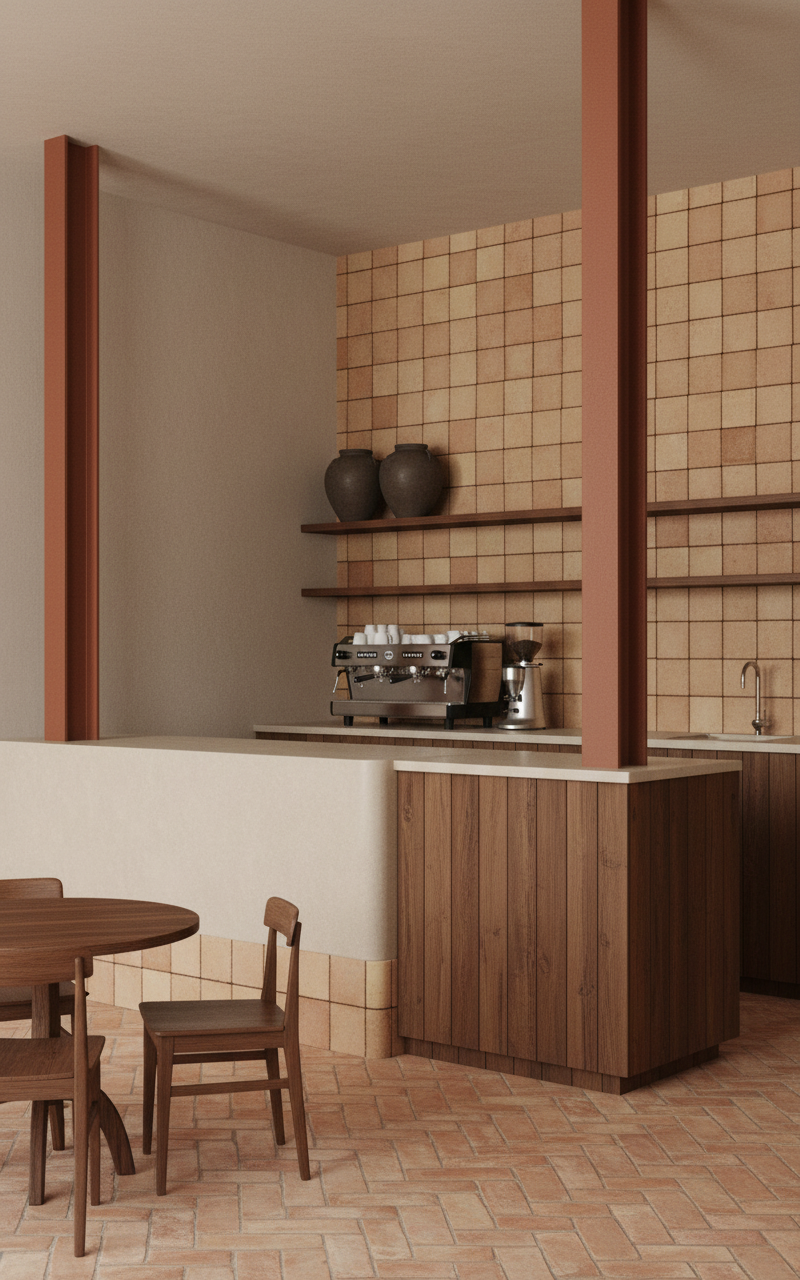 modernist exterior shot make this building look real and keep all of the colors the same show a sunny day with some small trees in iowa put a flagpole with an american flag flying out front architecture