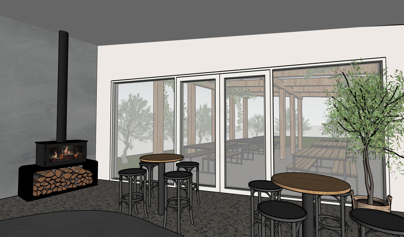 photorealistic interior photography style natural dynamic range balanced exposure slight softness in highlights realistic material imperfections shot as if on a professional full frame camera with natural interior lighting lower window brightness and reduce overexposed exterior light make logs under fireplace look lifelike