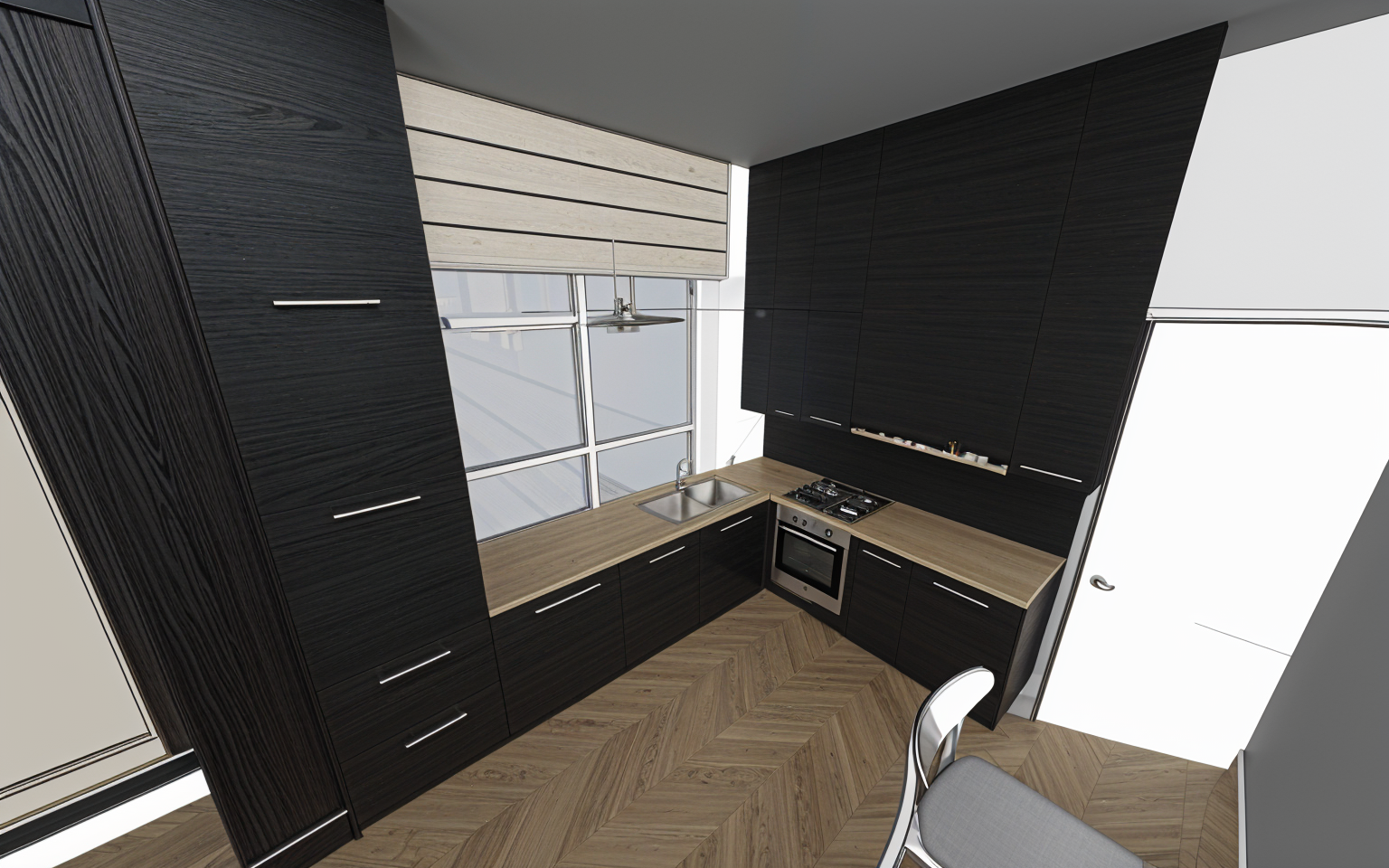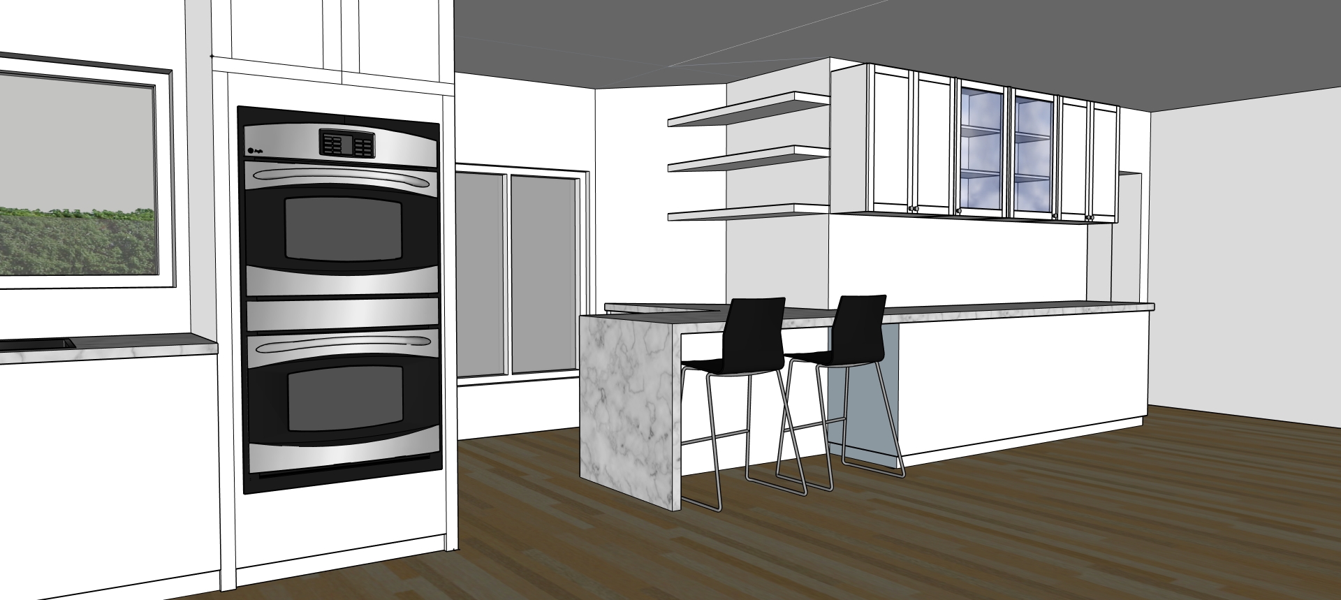 interior kitchen design sleek modern style stainless steel appliances with a polished silver finish white marble countertops with subtle gray veining cabinetry in a soft white with glass panels floating shelves in a light gray wooden flooring in a warm walnut brown barstools with black seats and chrome legs large window showcasing a lush green landscape atmosphere of elegance and sophistication bright natural lighting keep same design layout just change textures as described