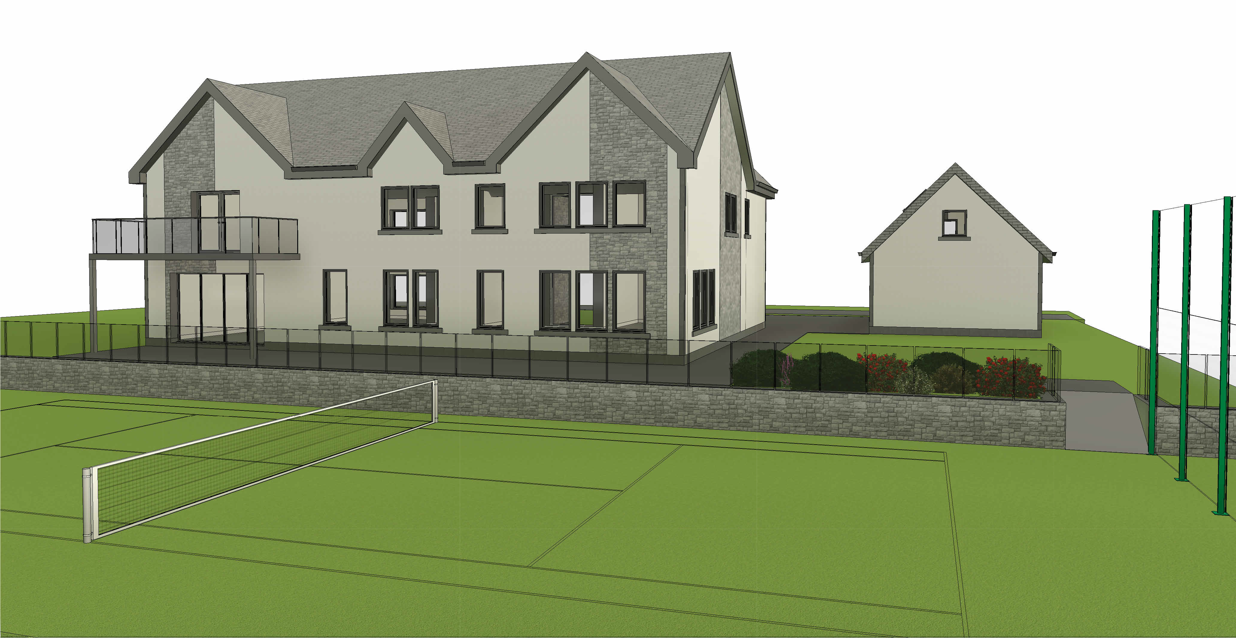 photorealistic architectural render using the exact existing camera view do not change the viewpoint framing scale proportions or geometry in any way do not add remove or modify any architectural elements of the main model preserve all existing materials colors textures and finishes exactly as modeled render the scene as is with increased realism only summer daytime setting with clear skies and natural sunlight soft realistic shadows and accurate global illumination surrounding environment to consist of natural landscaping with neatly maintained short cut green grass mature trees and subtle vegetation grass should appear evenly trimmed and well cared for background to include the side elevation of a neighboring house that matches the same architectural style scale materials and color palette as the main house positioned naturally in the environment without drawing focus away from the primary subject high quality clean professional architectural visualization no artistic interpretation no stylization no creative alterations