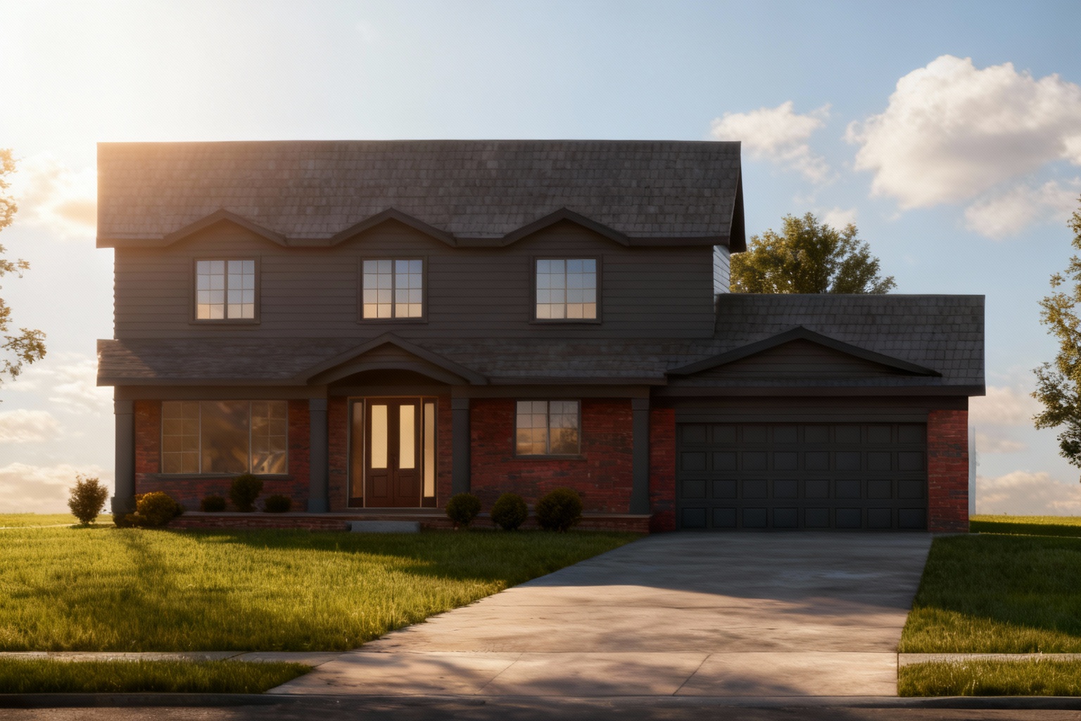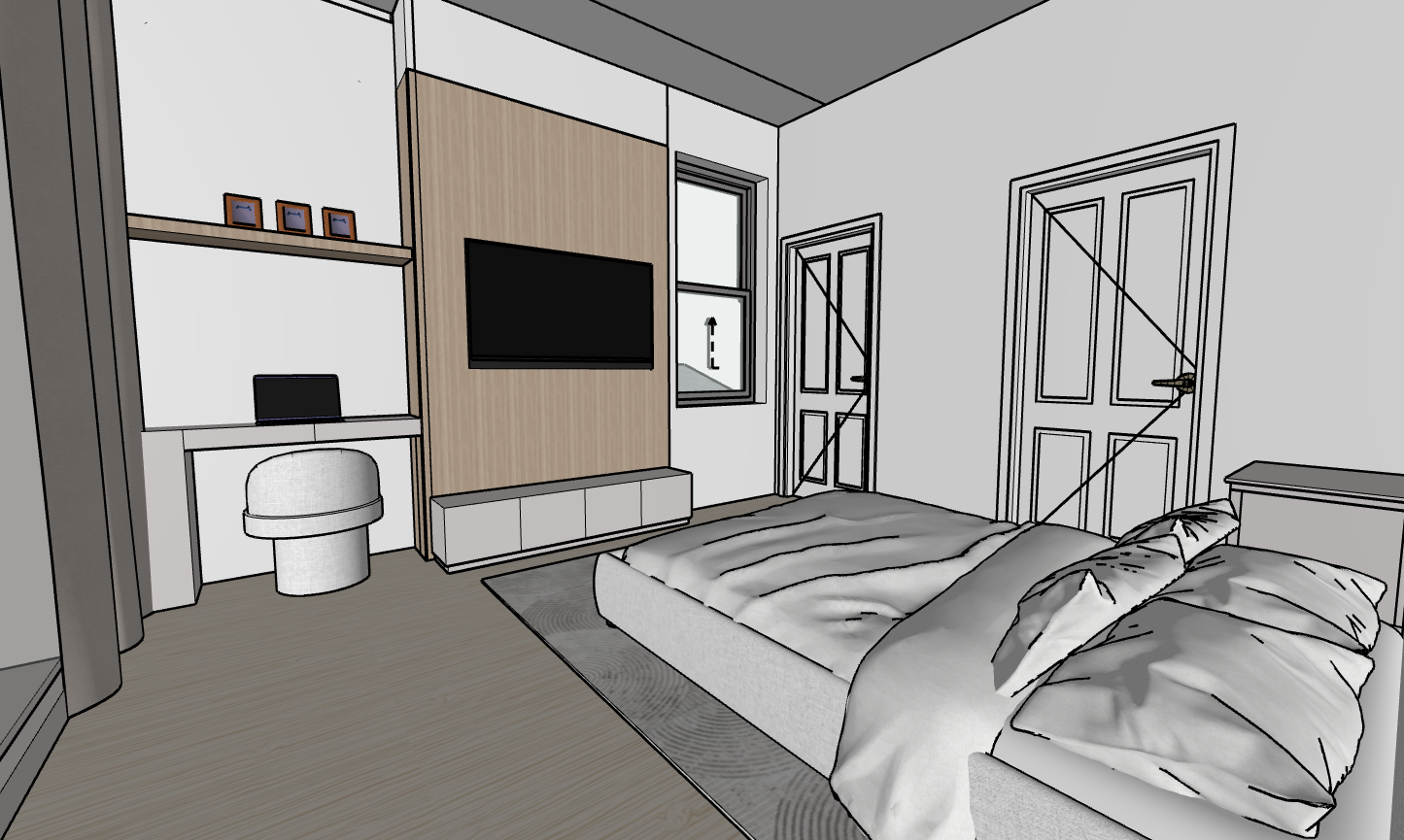 a photorealistic modern and minimalist bedroom interior architectural visualization the mood is serene bright and airy with abundant natural daylight architecture finishes walls smooth matte white paint finish floor wide plank light toned wood flooring like white oak or bleached ash with a matte finish glass wall left full height clear glass wall framed in dark grey metal sheer flowing white linen curtains are pulled to the side window right large vertical window framed in dark grey metal doors white 2 panel flat shaker doors one square panel on top one larger square panel on the bottom with sleek modern black or brushed nickel hardware built in elements media wall built in unit extending from the wall behind the bed tv it features a vertical panel of medium toned natural wood veneer light oak or walnut with integrated low white floating cabinets and a white floating desk tv modern black flat screen tv mounted on the wood panel furniture decor bed low profile platform bed upholstered in a light neutral fabric off white or light gray luxurious white bedding with soft textures and an accent throw blanket e g charcoal or deep gray knitted wool draped casually rug soft plush area rug under the bed in a light gray or neutral tone desk area white textured stool or chair minimalist decor on the desk and floating shelf modern laptop a small green plant curated books and minimalist framed art perspective maintain the original wide angle perspective to showcase the balance between the bed the built in wall and the light from the glass wall