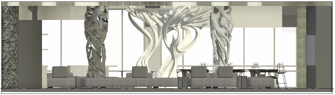 render true to material add ambient light from holes in ceiling model the abstract forms to be chrome render the sofa cushion to be the same material as the sofa