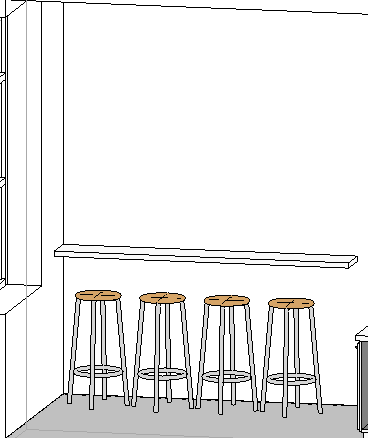 interior shot render image of breakfast bar seating white worktop black stools with a small back on them 3x hanging pendant lights black