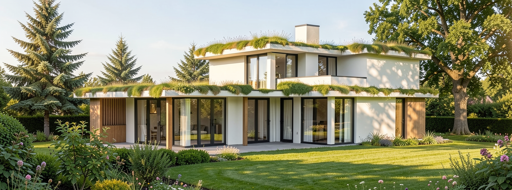 lot of light and reflects in the windows in the middle of the netherlands the lower roof is a sedum roof but don t let it hang over the roof end the garden has a few scots pines rowans and a pedunculate oak and a big lawn on the left side lots of sun stick to the original design and the original materials but make it real