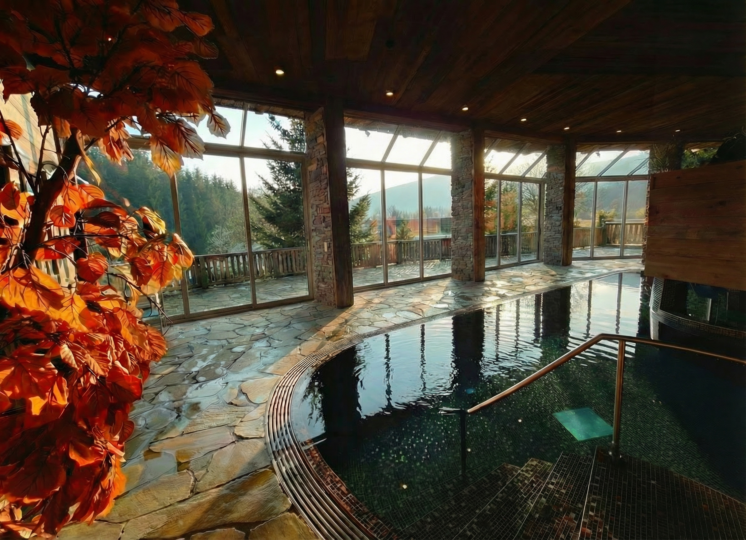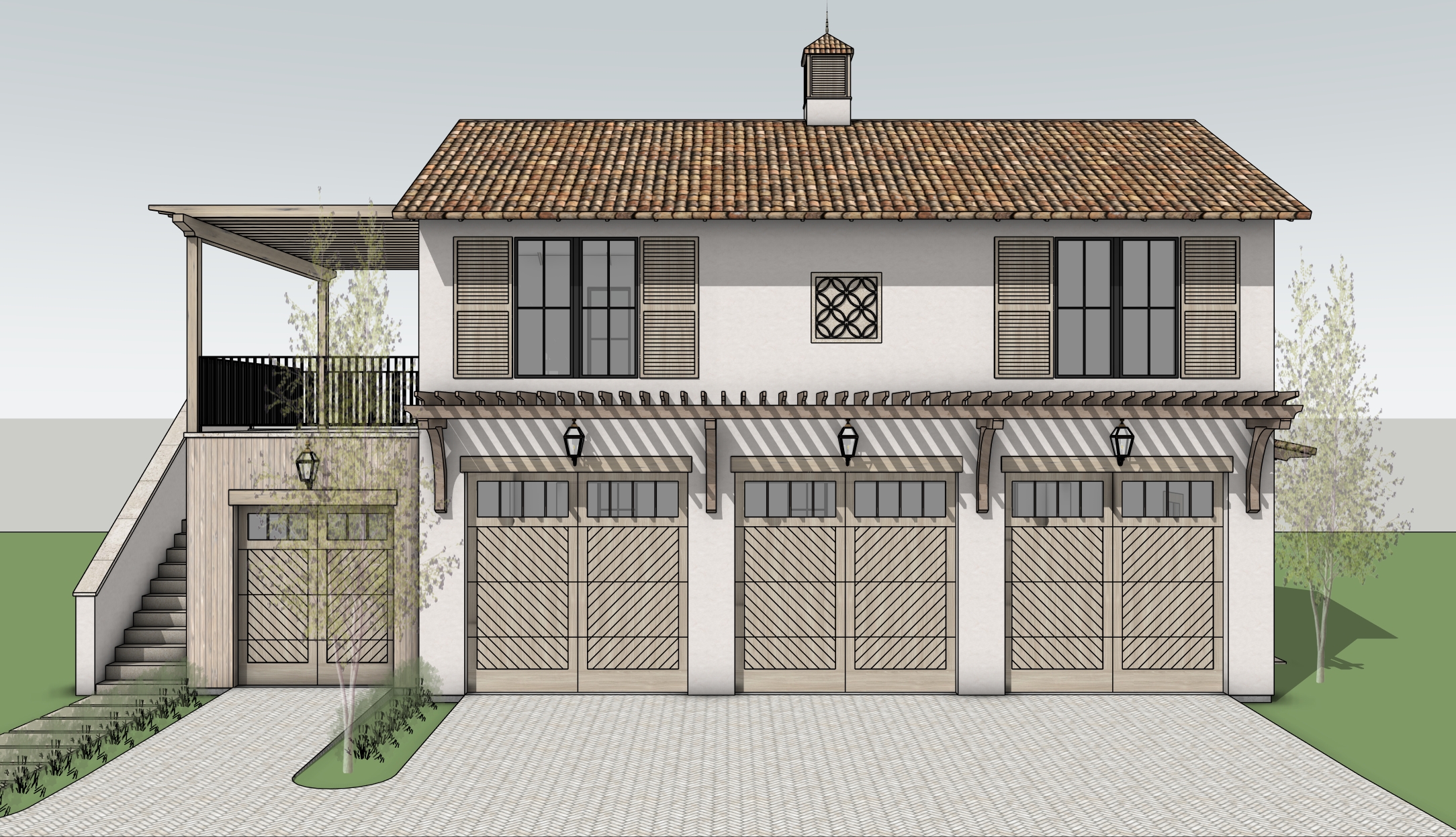 located in santa rosa beach florida on a flat lot surrounded by a forest of sand pine trees water oak trees and native foliage clear morning sky climbing vines on trellis above garage doors brick pavers at driveway