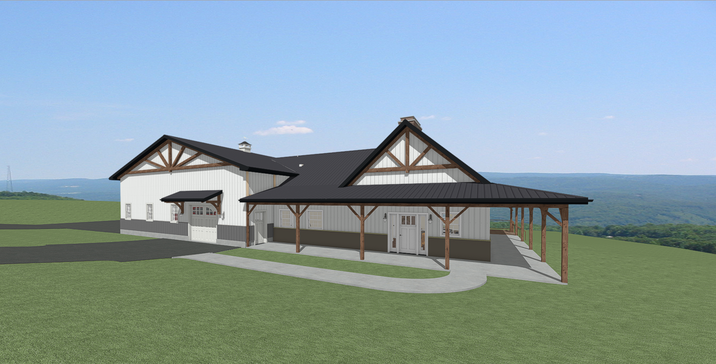 a high resolution ultra realistic rendering of a modern barndominium situated on a hillside with scenic mountain views in the background the building features white vertical metal siding with dark gray wainscoting and a black standing seam metal roof exposed timber trusses and posts add rustic character to the covered porch and gable peaks the front porch has natural wood posts concrete walkways and soft shadows from sunlight under a clear blue sky realistic textures for all surfaces metal wood concrete and grass with a bright natural daylight tone that enhances depth and craftsmanship detail