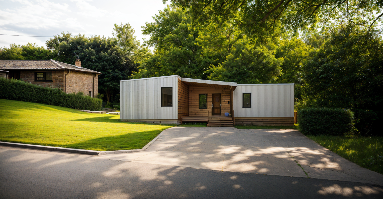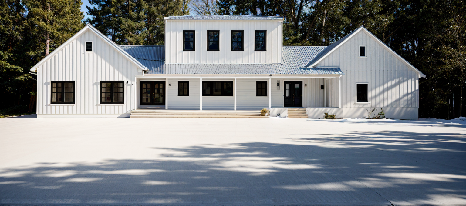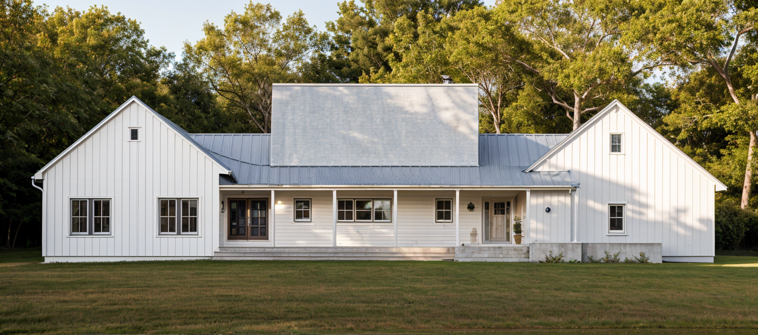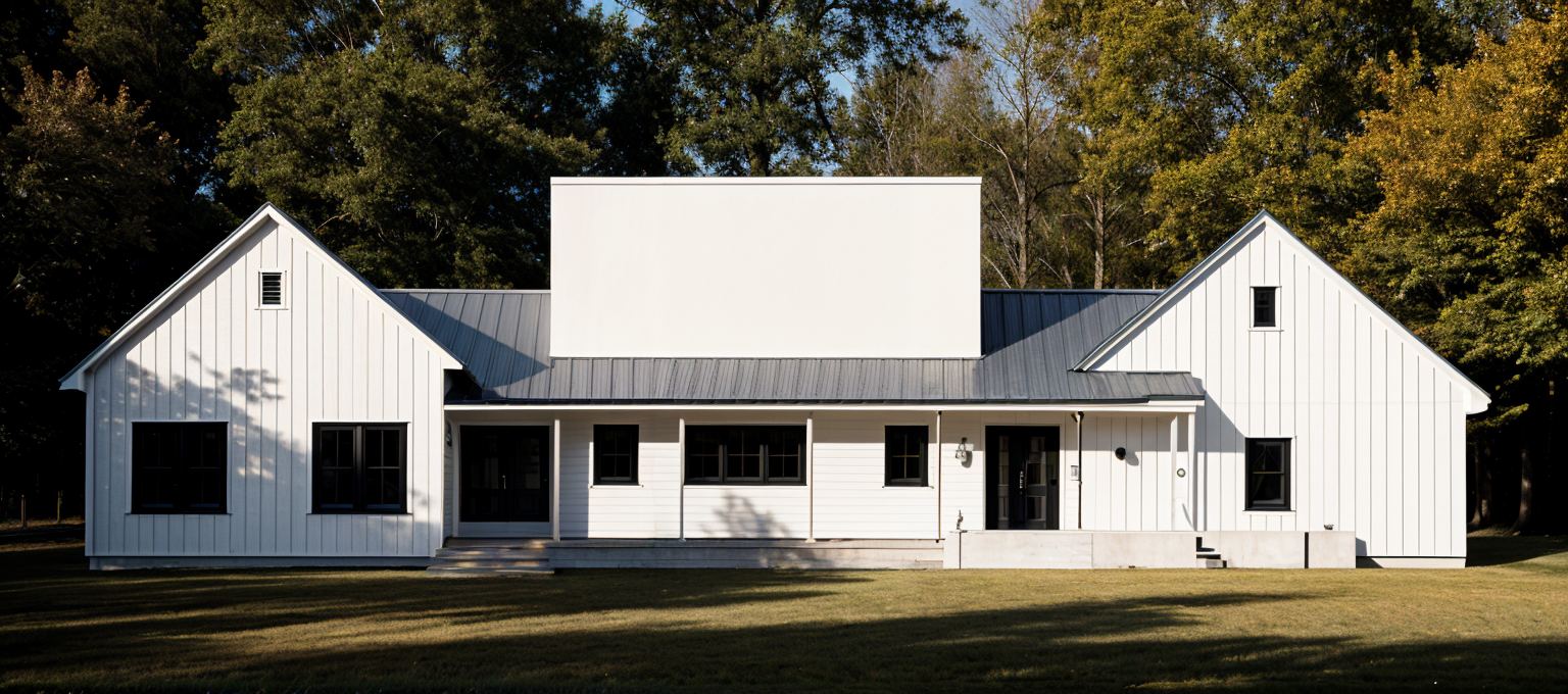 modern farmhouse with a blend of contemporary and classic design the exterior features a combination of dark charcoal and light gray horizontal siding contrasted by crisp white trim around the windows and doors the roof is a sleek modern style in matte black large windows with reflective glass create a sense of openness the front door is a welcoming shade of deep blue a spacious garage with frosted glass panels complements the overall aesthetic the house sits amidst a serene lush green landscape with a clear blue sky creating a peaceful and inviting atmosphere