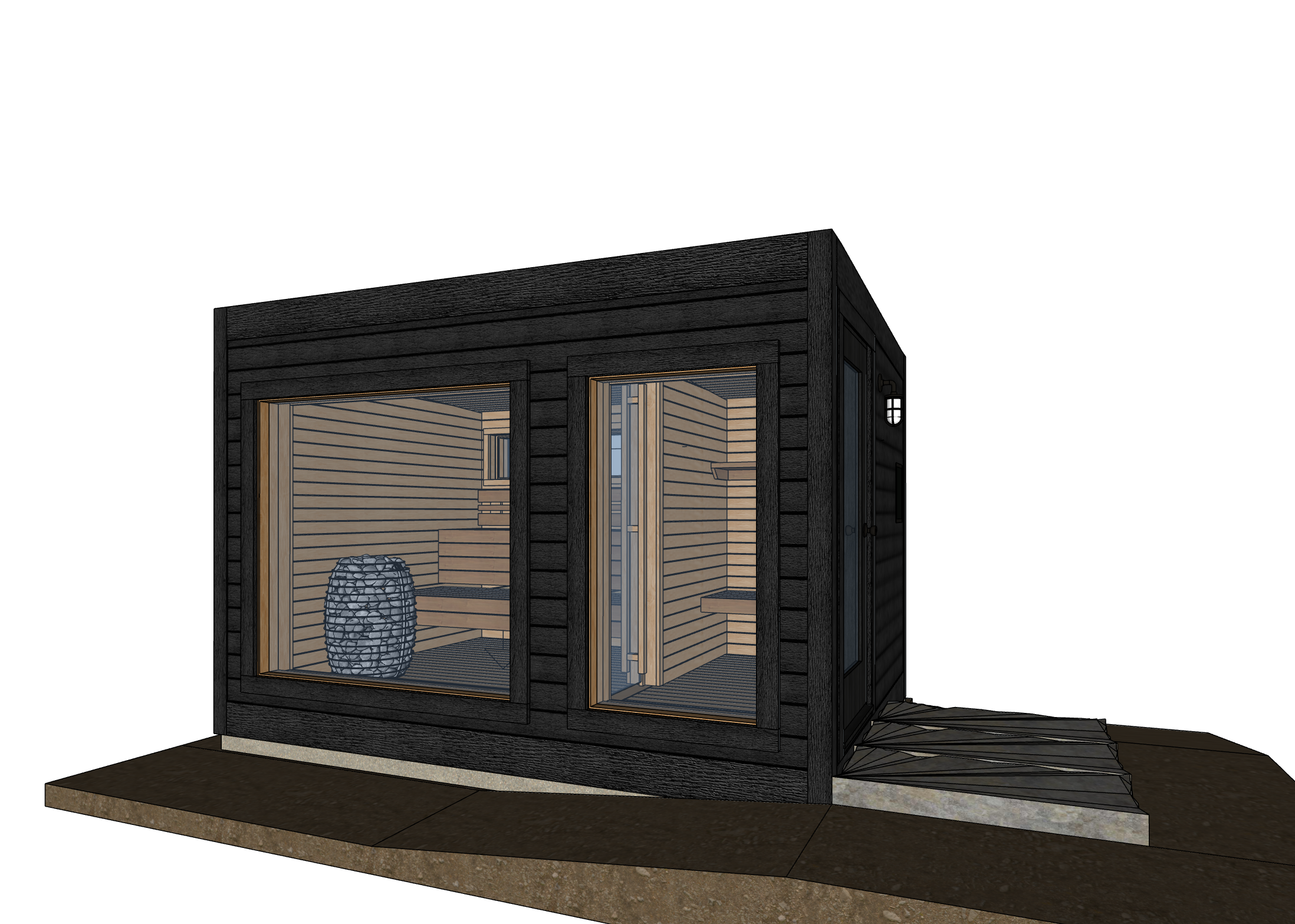 this is an outdoor sauna the back of the sauna is a forest