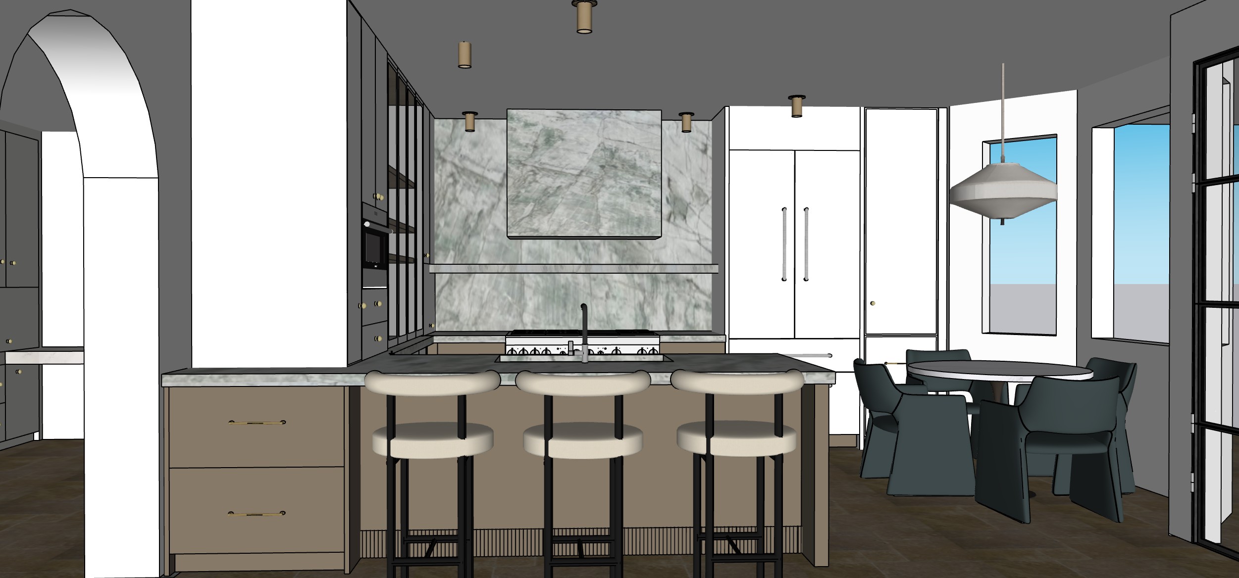 create photorealistic rendering of this kitchen add led lighting to glass cabinets and under slab shelf under hood add linen roman shades to windows and landscaping in backyard change flooring to noce colored tumbled travertine floors with versalles pattern keep olive green velvet dining chairs change all cabinets to farrow and ball old white