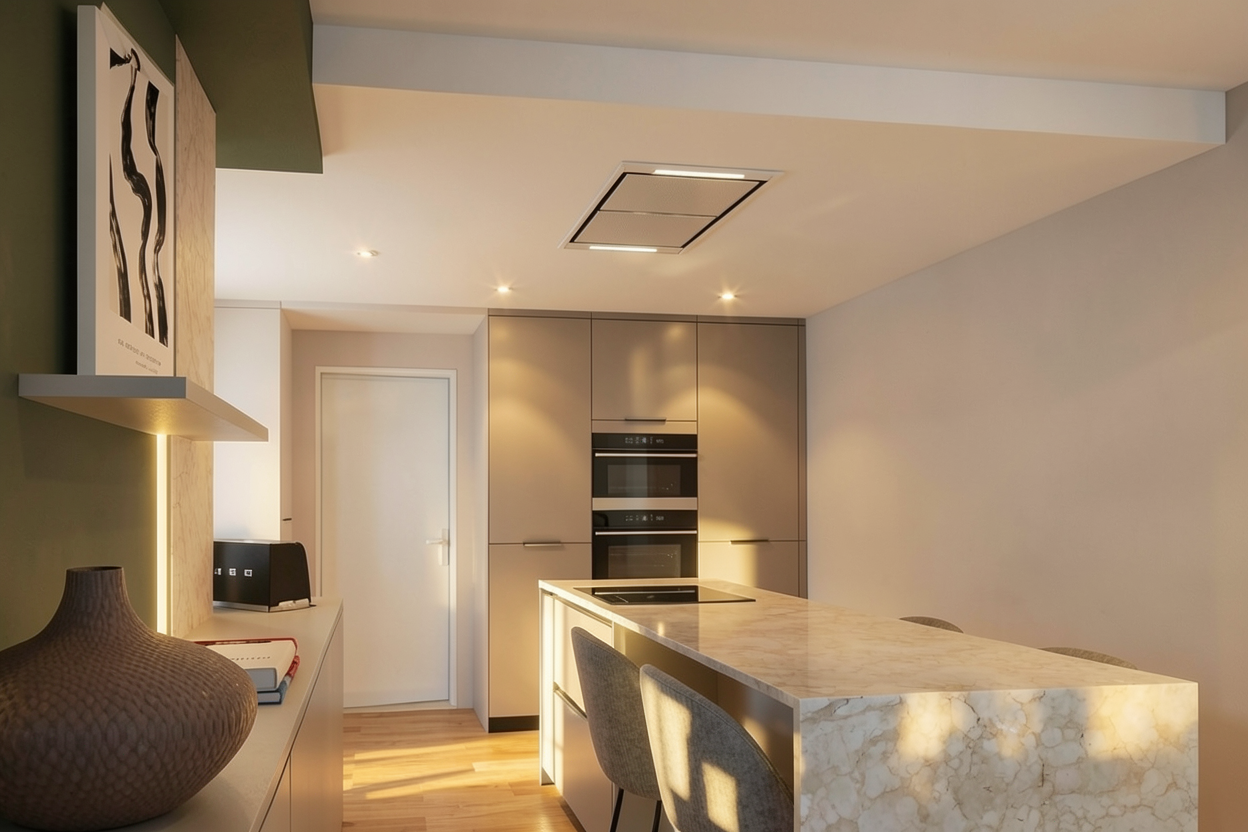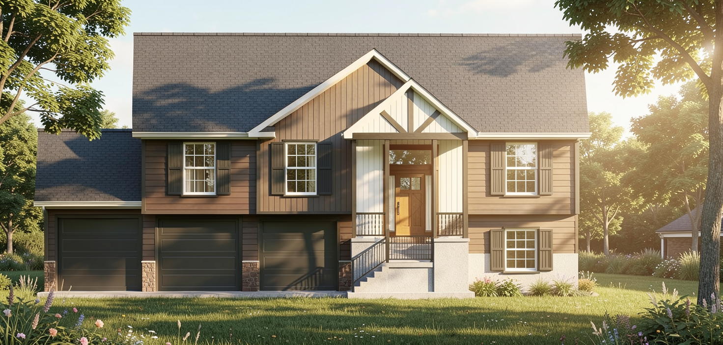 make it a photorealistic image with pre evening scene slightly developed residential area behind the site