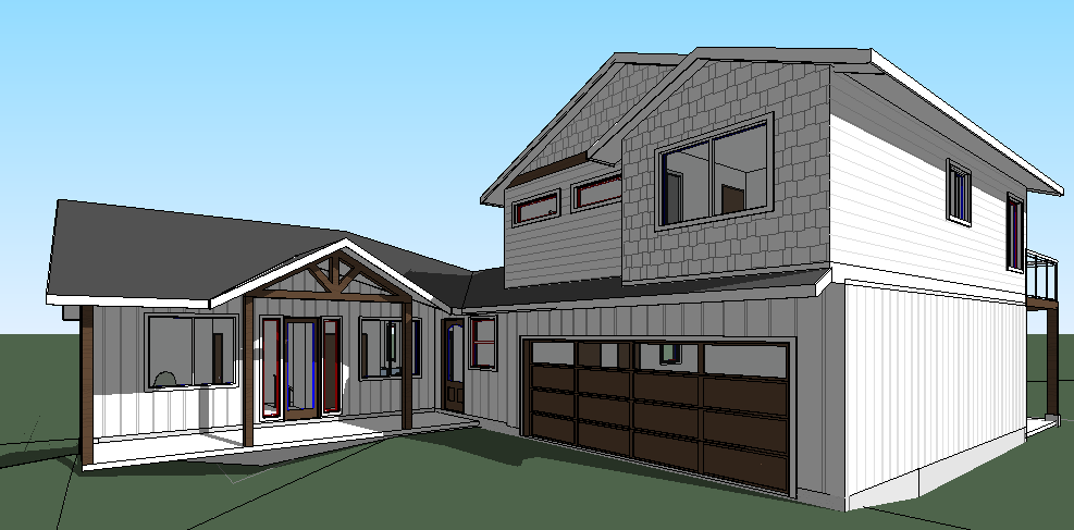add natural lighting and make look realistic add a driveway to the garage that also wraps around the right side of the garage add nice landscaping and surrounding trees create a downward sloping hill on the left side of the house this slope goes down 8 feet