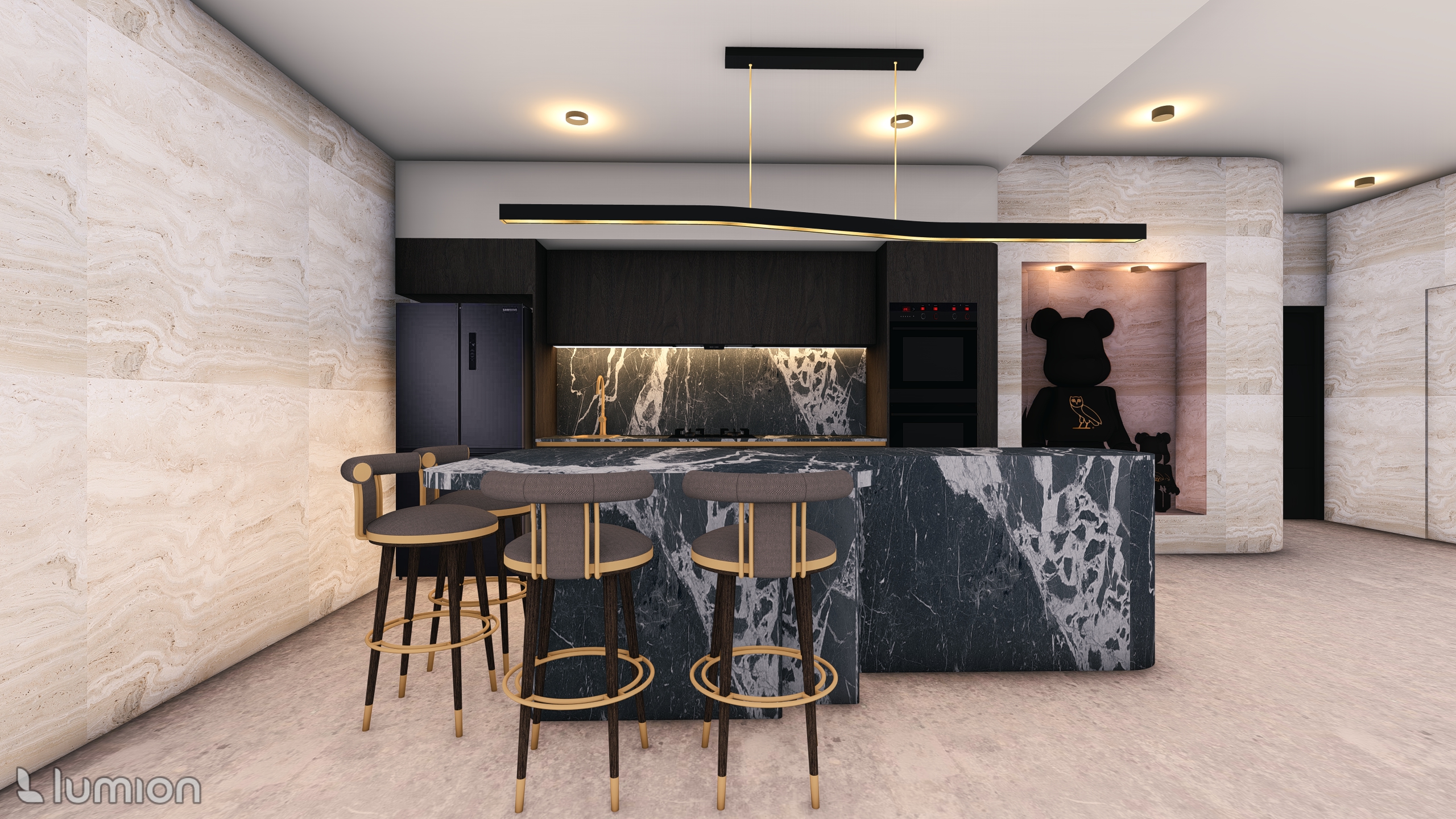 ultra futuristic neo futurism luxury minimalist kitchen interior the left side wall is clad in soft beige travertine panels while all remaining walls are smooth pure white creating a refined contrast architecture features flowing curved surfaces and seamless transitions a dramatic monolithic kitchen island made from bold black and white veined marble with softly rounded aerodynamic edges anchors the space behind it integrated matte black appliances and invisible dark cabinetry form a clean futuristic plane a dynamic illuminated marble backsplash with crystalline fractal patterns adds depth and sophistication futuristic concealed led strips trace the curves of the ceiling and island creating a floating weightless effect above the island a sculptural black and gold asymmetrical light fixture hangs like kinetic art bar stools include slender carbon fiber legs gold detailing and floating upholstered seats to the right a curved recessed niche displays two matte black ovo bearbrick figures under soft warm spotlights the environment feels ultra clean hyper modern and luxurious with cinematic lighting high end materials and 8k lumion style photorealism