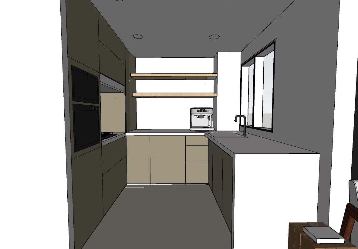a modern minimalist kitchen with elegant design cabinets in matte dark khaki green countertops and both end panels in bright white gloss bright white walls for a clean look ceiling in white with recessed lighting for warmth shelves in light oak wood adding a natural touch large window with black frame allowing natural light stove in sleek black with a glossy finish include a modern stainless steel coffee machine atmosphere is cozy and inviting with a balance of modern elegance and warmth