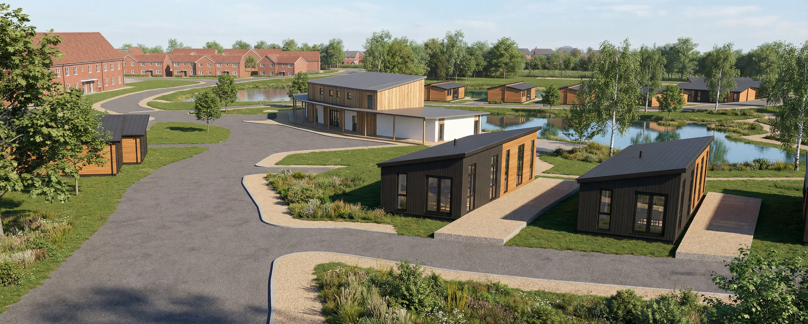 hillside setting in cincinnati ohio with a natural sloping terrain and surrounding greenery late afternoon golden hour lighting with warm sunlight long soft shadows and gentle highlights across the landscape a beautiful dramatic sky with soft clouds in shades of orange pink and light purple creating a vibrant sunset atmosphere very crisp and clear image with high quality lighting on building very subtle atmospheric haze in the distance cinematic mood realistic environment soft ambient lighting high dynamic range ultra realistic rendering clear textures and colors on building no sun haze in front of building furnished and lit upscale apartment interiors through windows road and driveways leading up to wooden garage doors in the foreground historic mt adams cincinnati ohio on the hillside above