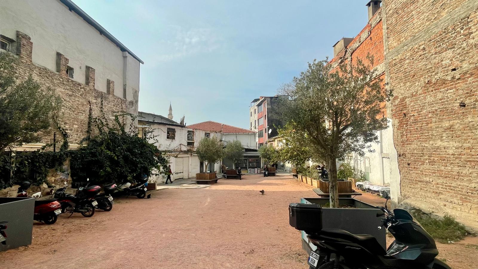 urban square redesign in a mediterranean city inspired by the existing courtyard shown in the image the scene features old brick and stone fa ades olive trees warm light and a calm community atmosphere design a contemporary yet contextual public space with natural materials such as wood stone and terracotta include minimal street furniture shaded seating areas planters with greenery and soft lighting for evening use keep the pedestrian flow open and inviting maintain the local charm and integrate modern architectural elements with respect for the historical textures highly detailed realistic architectural rendering daylight scene
