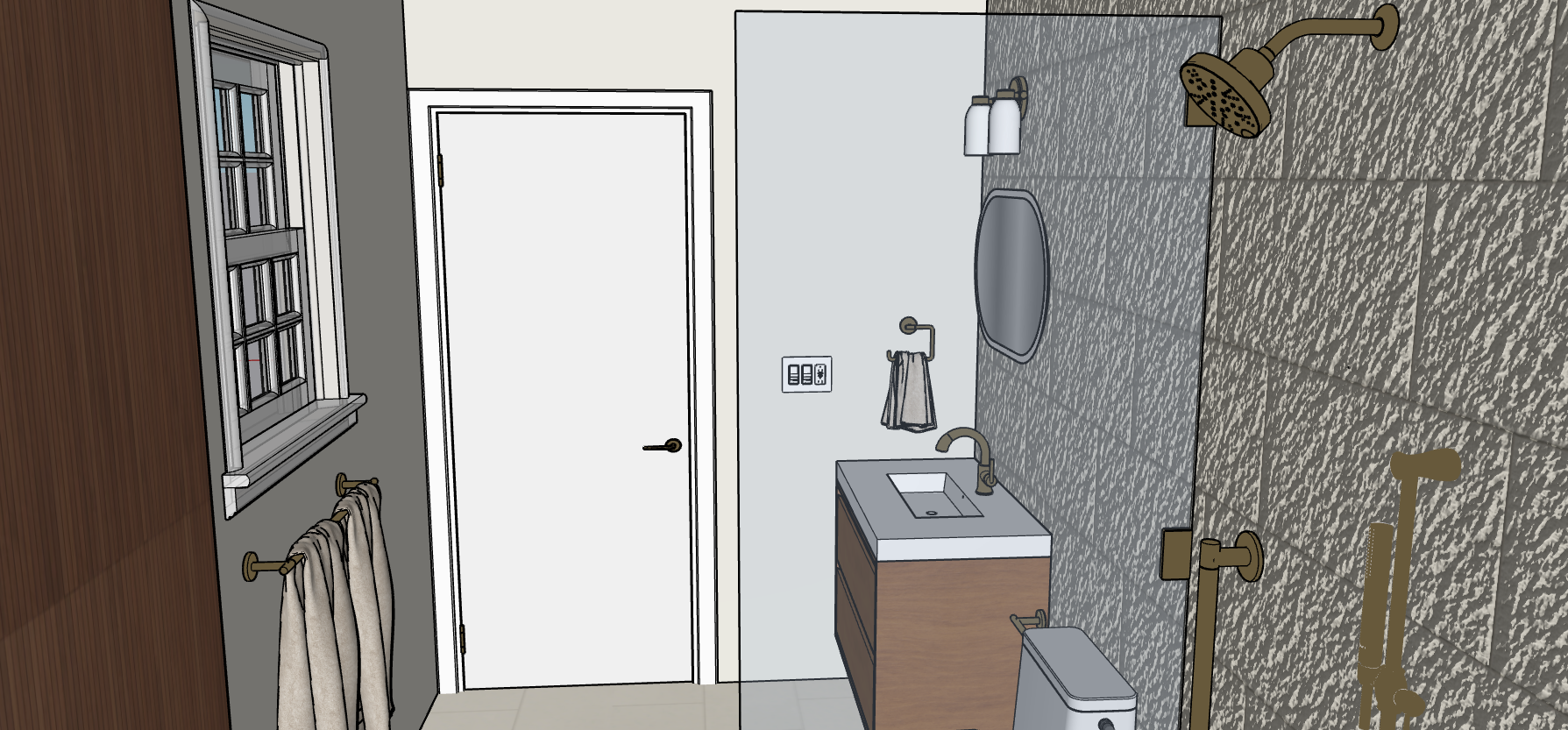 maintain all existing geometry materials and proportions the vanity light uses white semi transparent glass sconces with soft diffusion the mirror has a subtle white backlit halo that is off no glow the shower contains no lighting of any kind the niche shower head and shower wall are not light sources overall scene should be brighter and evenly lit using neutral 3500k ambient lighting from ceiling fixtures only do not add move or reinterpret any light sources wood slat panels and champagne bronze fixtures and accessories