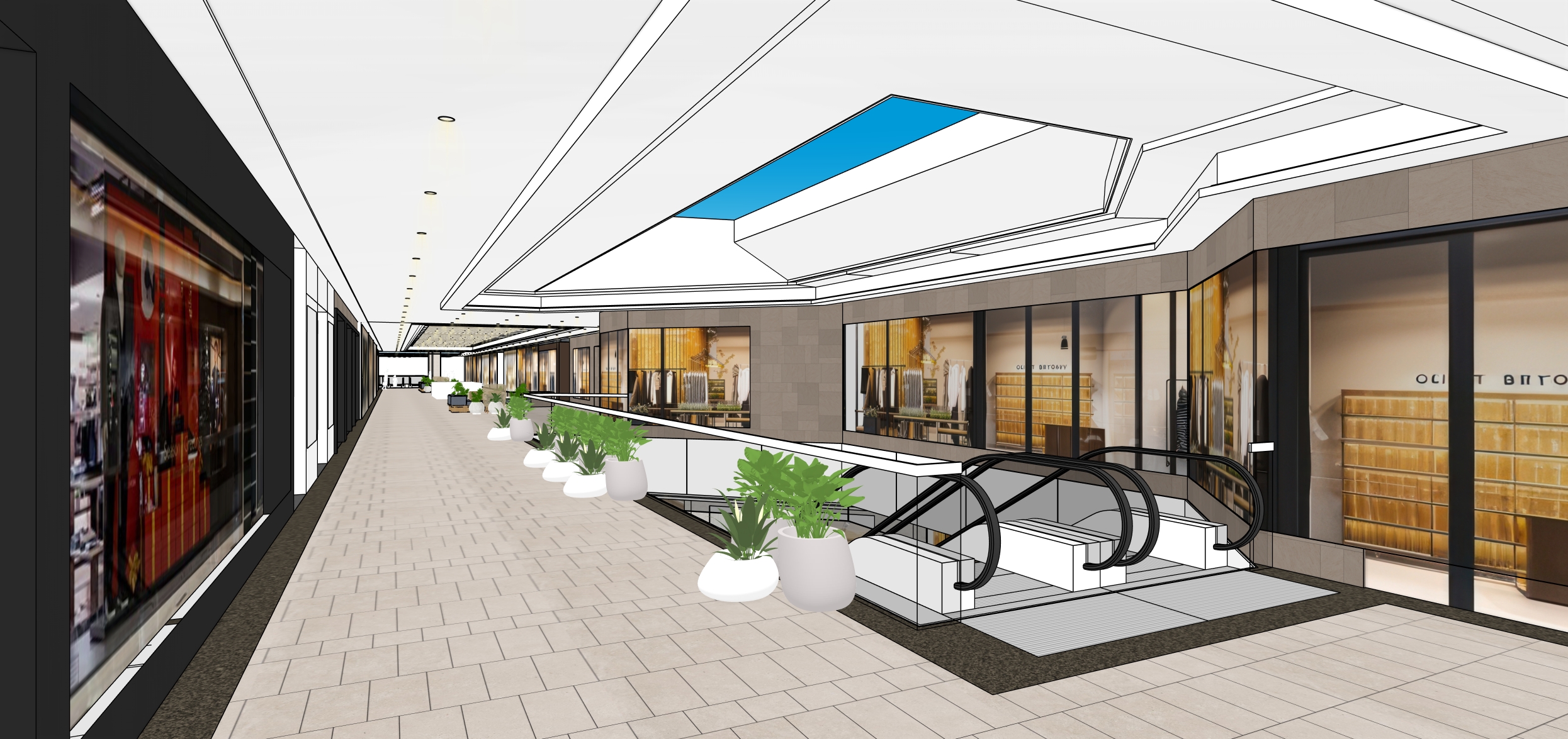 stylish modern indoor shopping center sleek design with a luxurious atmosphere include satin tile floors in soft beige tones storefronts with large glass windows framed showcasing elegant overall the ceiling should be white with skylight on the right hand side top add lush green potted plants in the planters do not change the any color shapes and texture