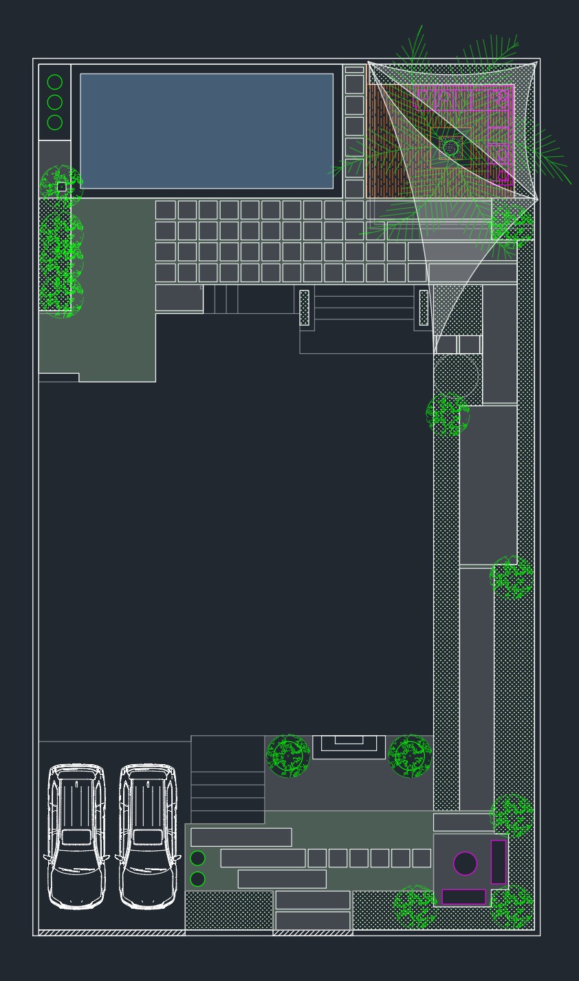 render a top down view of a modern outdoor space the large rectangle is a shimmering turquoise pool surrounded by a sleek gray tiled deck that emits a contemporary vibe surround the pool with lush green foliage adding a refreshing and vibrant atmosphere create a small garden in the corner with a variety of colorful flowers such as pink purple and yellow bordered by rich brown soil include a gray stone pathway connecting different areas emphasizing elegance and structure place two sleek black cars in the lower left paved area adding a touch of luxury overall atmosphere is serene modern and inviting bathed in soft natural sunlight