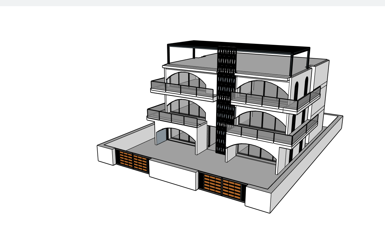 use the sketchup screenshot as a loose reference for general scale and footprint but reimagine the building as a luxurious 3 floor apartment complex in djibouti elevate the massing with elegant volumetric shifts terraces and refined proportions design the facade using high end materials like natural stone travertine smooth stucco and bronze or black metal accents feature large floor to ceiling windows shaded private balconies vertical fins or louvers for sun control and lush rooftop or terrace greenery the balconies have glass railings as well as shadded louvers on the arched openings that are on the top two floors make those louvers visible and uniform on all of the balconies highlight landscaped entrance areas ambient pathway lighting and modern exterior furniture the environment should include palm trees tropical plants and clean urban pavement realistic midday lighting with sharp shadows soft reflections on glass and a warm elegant ambiance ultra detailed cinematic realism with high fidelity and rich architectural textures set the scene on afternoon with sharp shadows adding light fixtures to the building enhancing material richness the surrounding context should show neighboring houses in close proximity reflecting typical djiboutian architecture flat roofs textured facades and small scale local character include tropical landscaping palm trees climbing plants and stone paving for a lush high end feel realistic photo grade render with cinematic atmosphere and no visible post processing artifacts