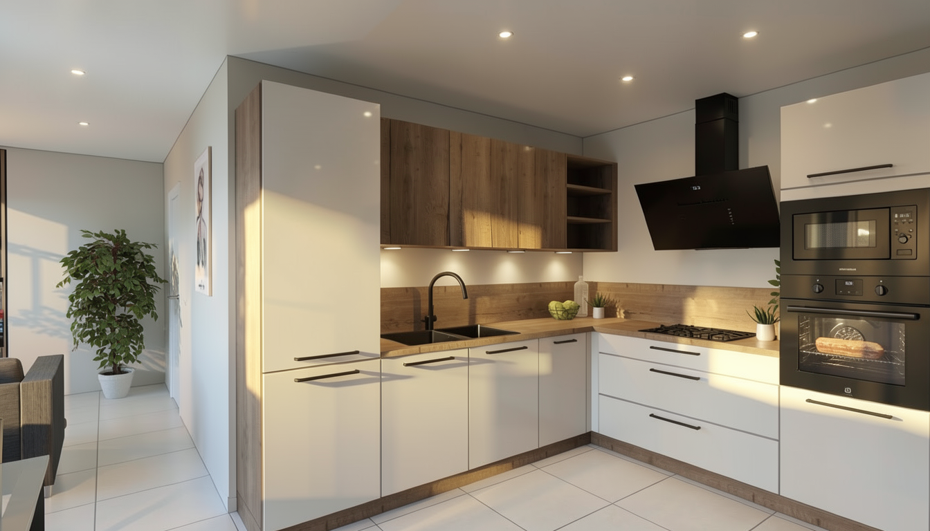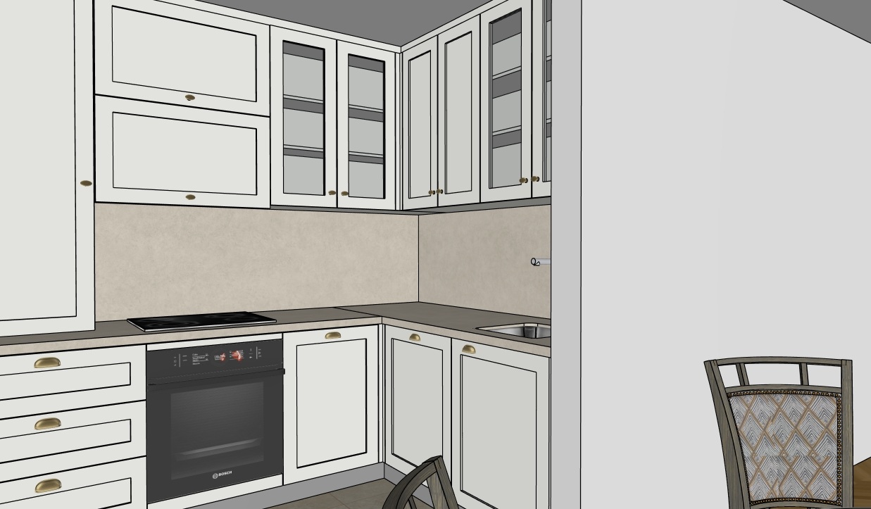 cozy and modern kitchen interior featuring elegant white cabinetry with subtle gold handles the countertops have a sleek gray finish complemented by a warm beige backsplash the atmosphere is inviting and homely with soft ambient lighting the oven is a modern black design providing a contemporary contrast a chair with patterned fabric in shades of gray and gold is partially visible adding texture and sophistication the overall mood is warm inviting and effortlessly stylish put led lights under the up kitchen cabinets put some plate or glasses inside the cabinets with glass doors put some flowers or kitchen decor on the working top