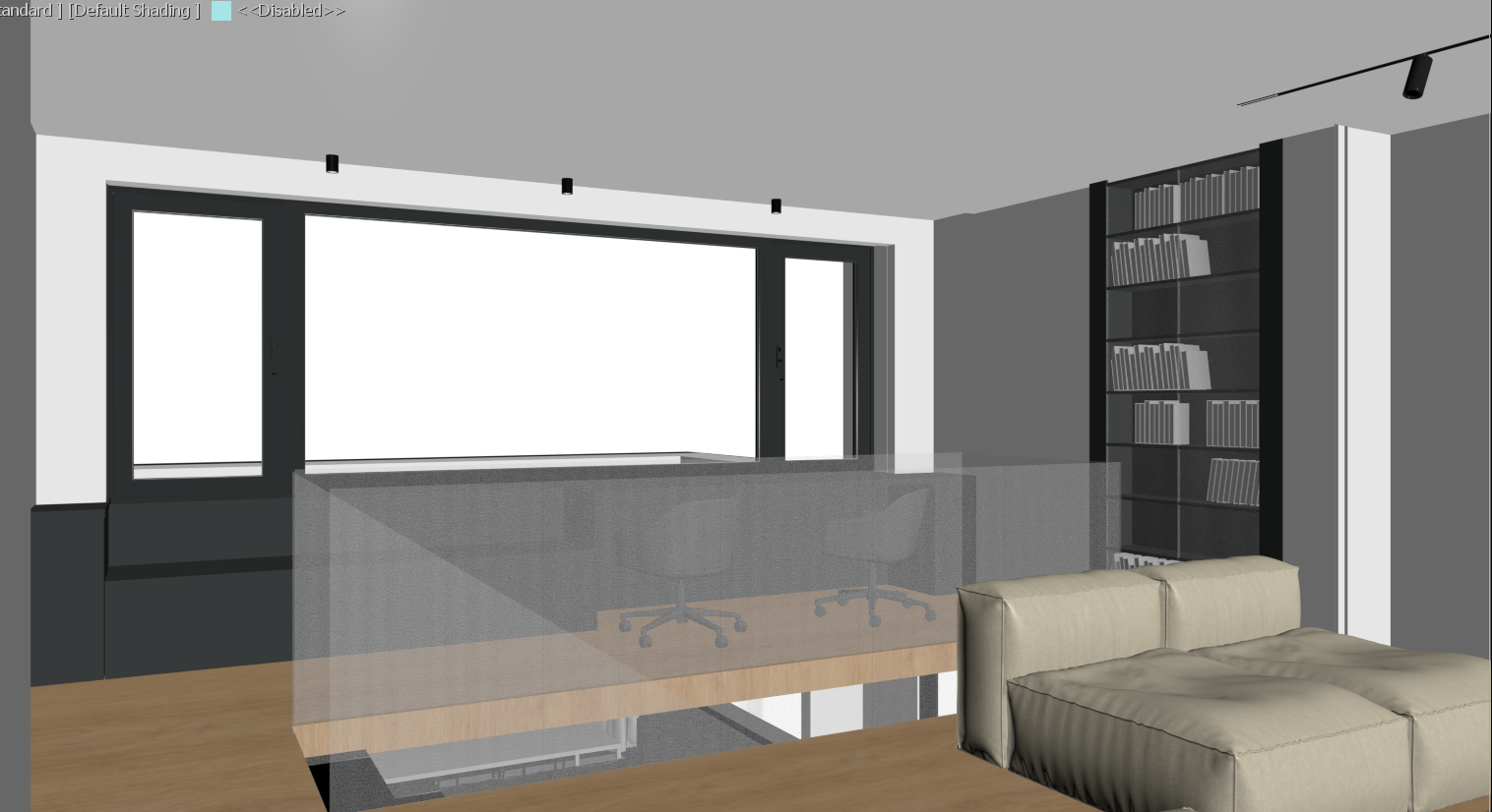 modern minimalist room with large black framed windows soft natural light flooding in black bookshelves with black glass doors adorned with white books and led light inside dark gray furniture including a sleek black chair walls painted in white creating a clean and airy ambiance light wooden flooring adds warmth atmosphere serene and contemporary the highlighted elements in blue are glass railings for the stairs outside the window in the distance there is greenery and trees