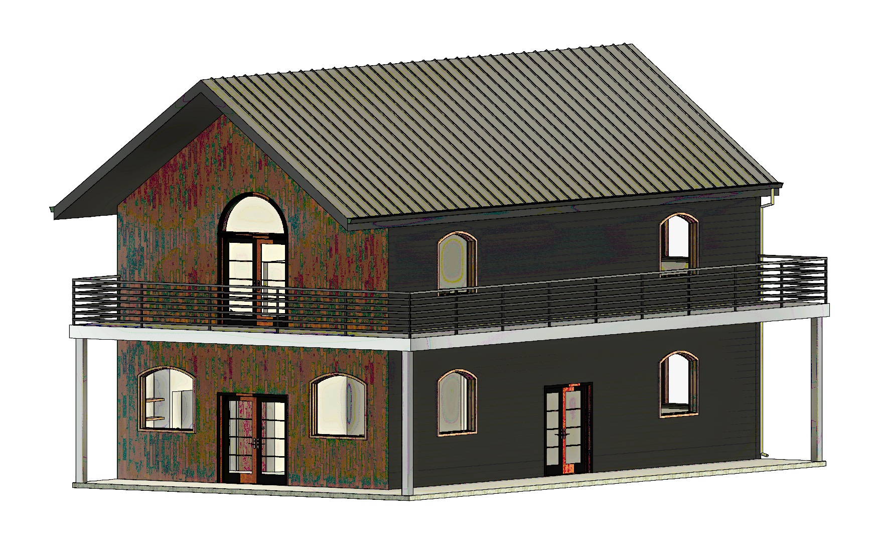 convert this floor plan into a realistic isometric 3d view of a full house show the space from an elevated angle with furniture walls and details visible make it into a sketch front is cedar red vertical wood panels side is matte black horizontal metal panels trim on doors and windowss is black use the same furniture as shows on the plan do not change the orientation of the floorplan