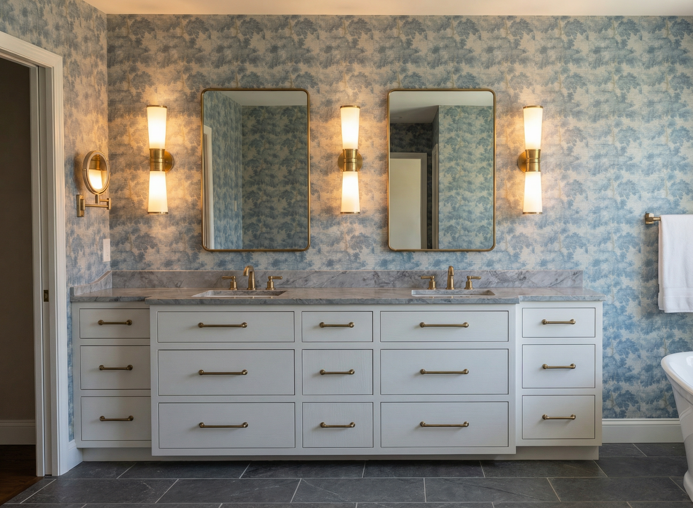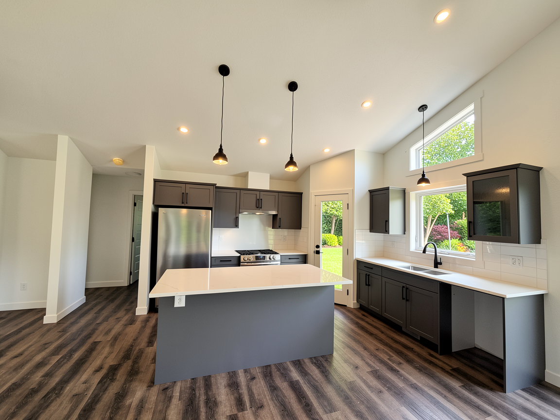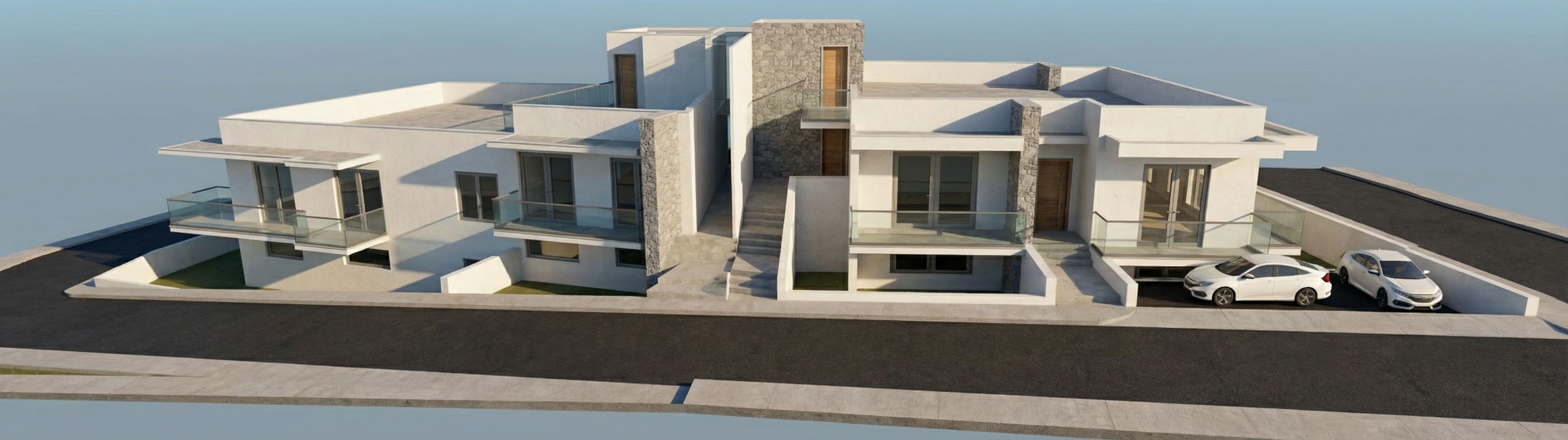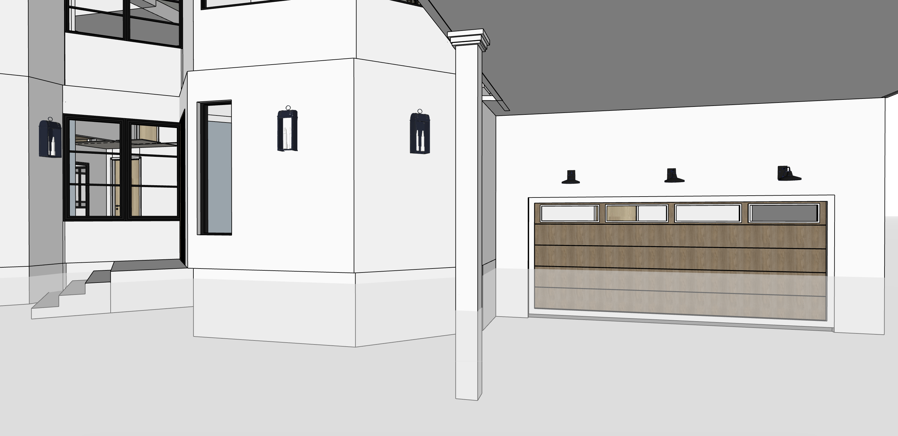 recreate a photorealistic rendering of this exterior with light grey nu cedar shingle siding keep light oak garage door add lighting add same light oak wood to ceiling of balcony add concrete driveway and landscaping