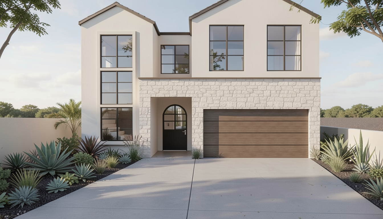 needs this to look like a modern transitional house add minimal landscaping but make it look elegant like suculents this willbe in a residential lot add driveway in front of garage add trees next to side like a landscape alomst