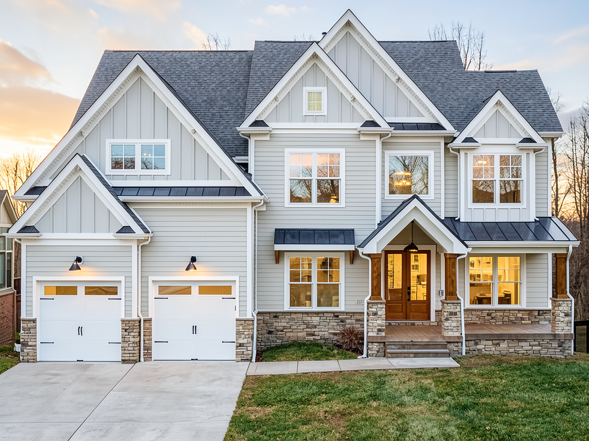 photorealistic rendering of house with low tree covered mountains in the background maintain exact colors from source image siding is blue gray