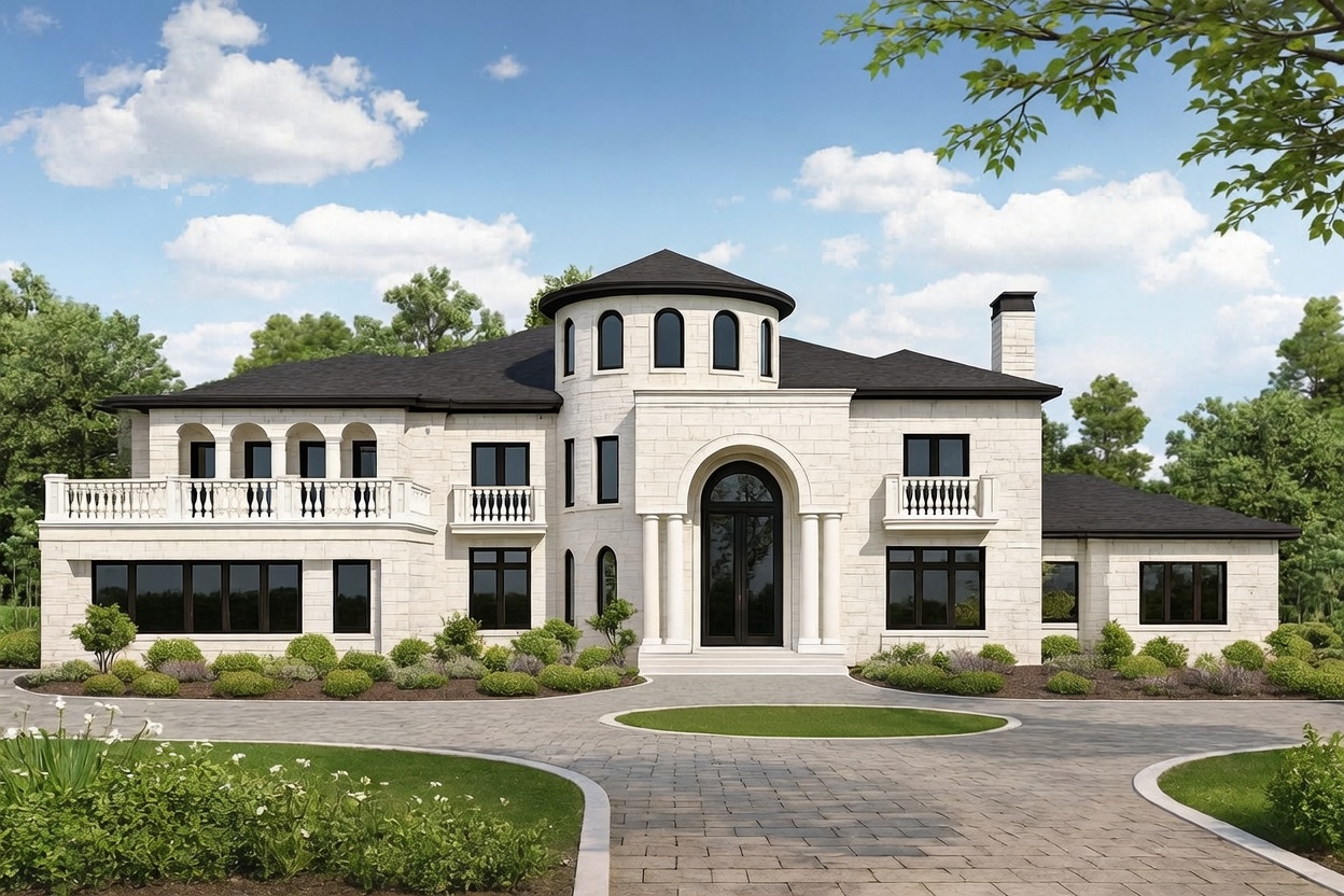 change the view above to more of a creamy stone color with a limestone grey trim around the windows keep the view exactly the same with all other materials remaining the same